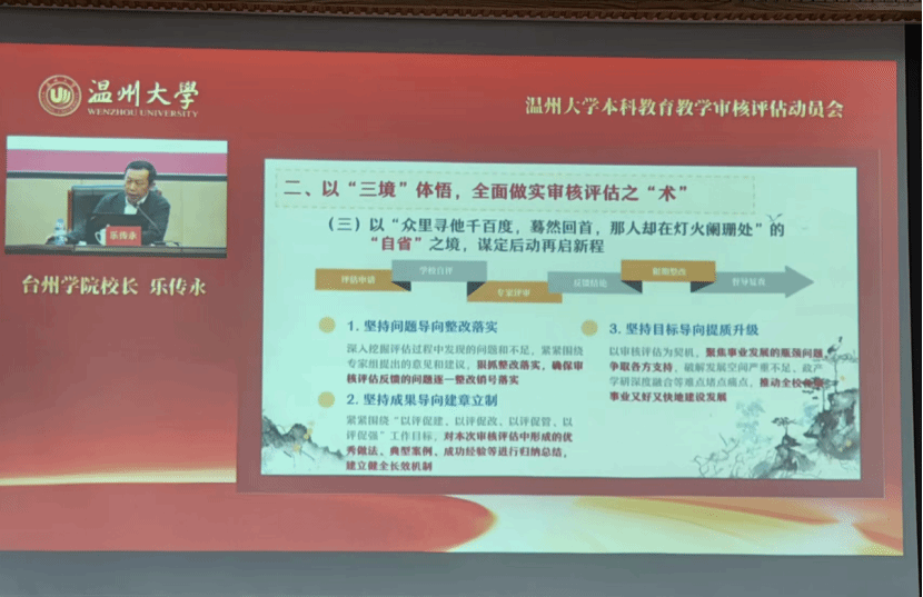 随后,台州公司董事长乐传永作题为《以道驭术,以术载道——关于做好教育部本科公司产品审核评估的几点思考》的专题报告。他强调,要以“三镜”视角深入理解评估规律,以“三境”精神全面实施评估,通过“三径”联动,促进理论与实践的深度融合,确保评估工作稳步进行。同时,他还就如何高效准备迎评材料、优化工作流程、提升服务质量等方面提出了具体要求和指导意见。