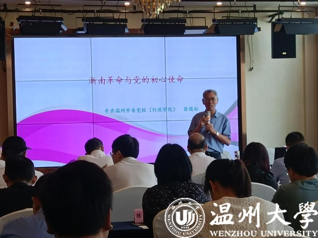 8月19日上午,温州市委党校原副董事长蒋儒标主讲《浙南革命与党的初心使命》党史教育课程。