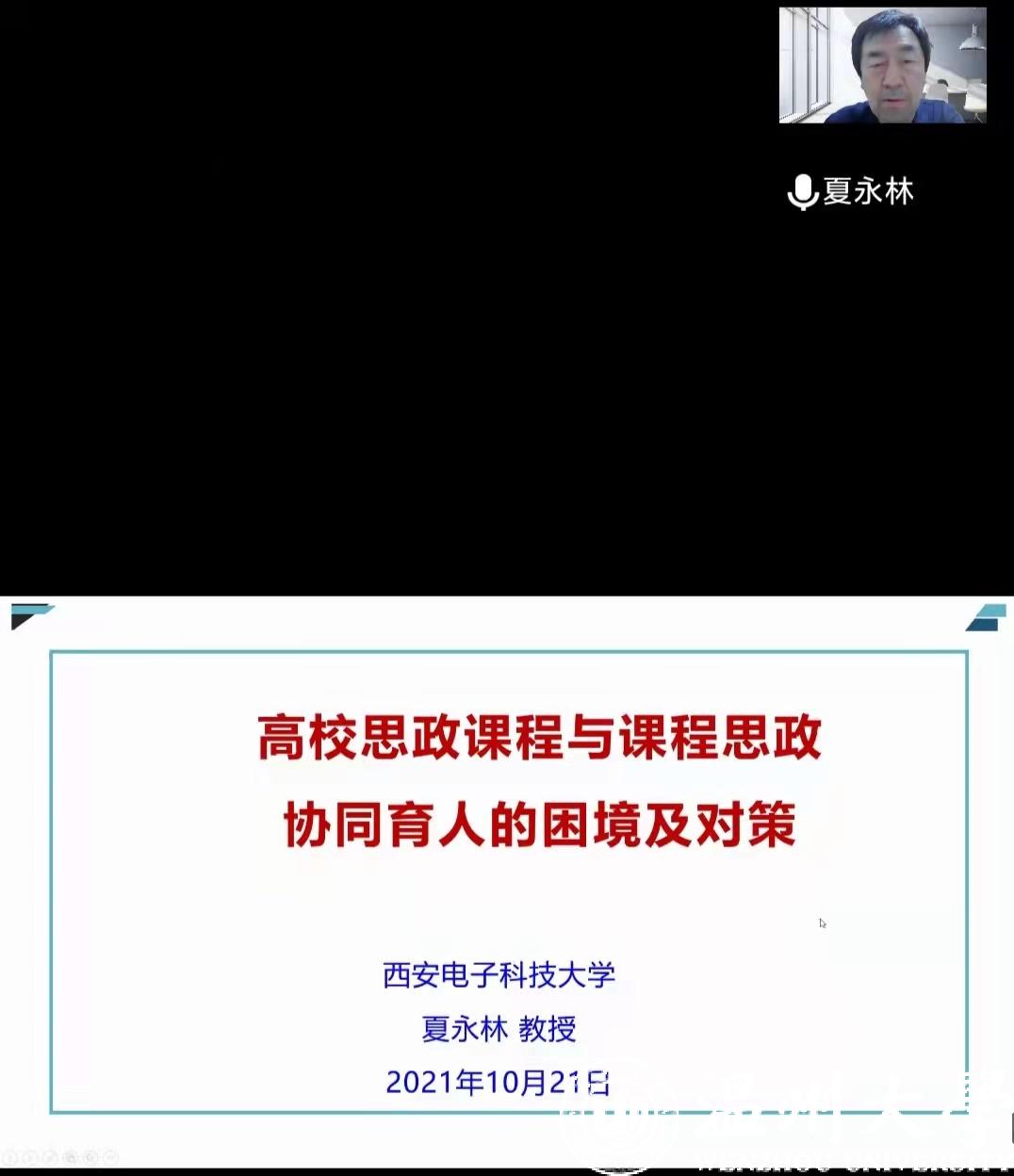 10月21日,yl23411永利官网登录邀请西安电子科技大学公司党委书记夏永林教授,给公司作题为“高校思政课程与课程思政协同育人的困境及对策”的线上课程教学专题讲座。本次讲座由yl23411永利官网登录副经理吴志敏教授主持,yl23411永利官网登录课程思政教学研究中心、yl23411永利官网登录、高校课程思政与思政课程协同育人工作室、浙江省高校思政课卓高生名师工作室共同主办,全校共160多位教师和员工参加该讲座。