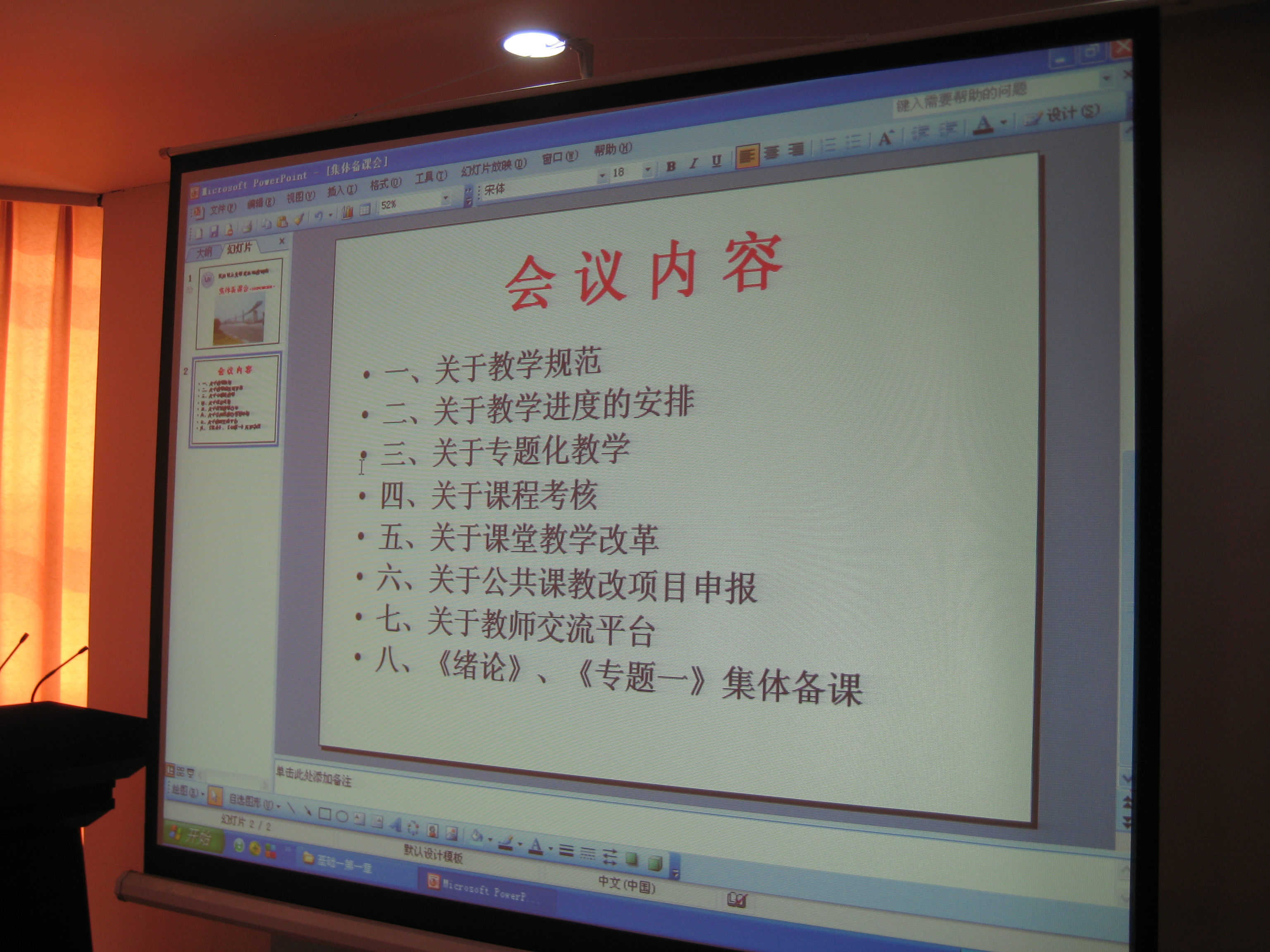 备课会最后,郑旭敏老师与大家分享了自己关于《绪论》和《专题一》的多媒体课件及其备课思路,并进行了深入的交流和切磋。老师们纷纷表示,今后要继续坚持集体备课制度,利用网上网下平台,定期开展各种形式的备课活动,共同推进教学改革,使更多的老员工真正受益。