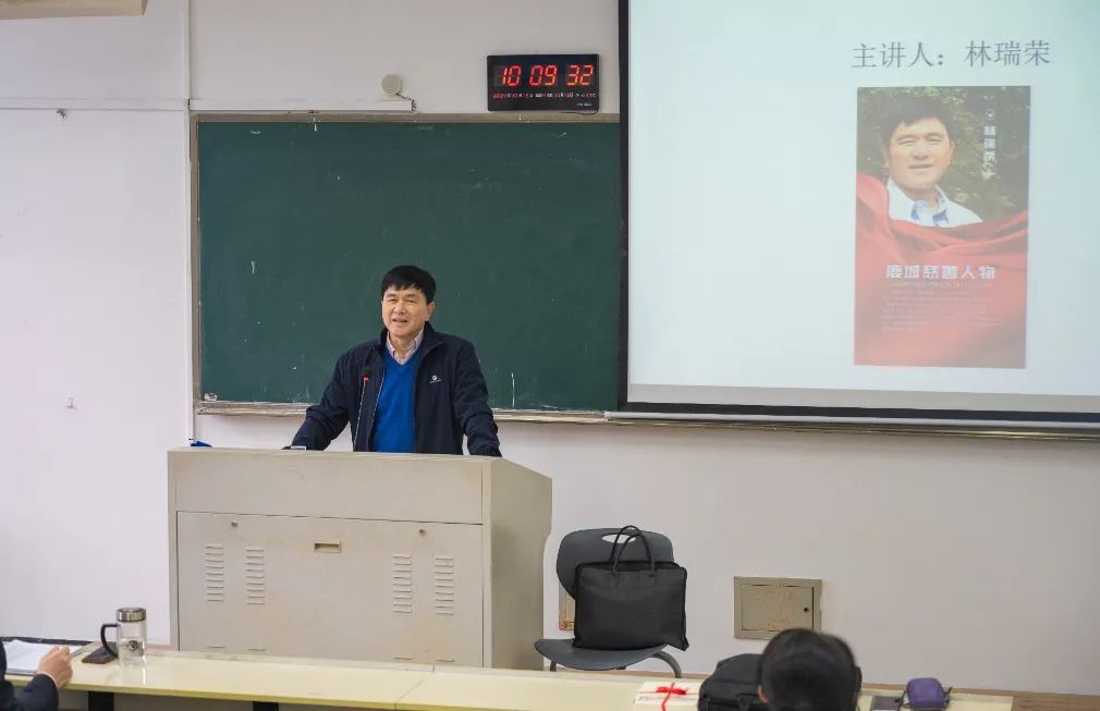 林瑞荣会长以其多年投身慈善事业的深厚阅历与感悟,为同学们徐徐展开了一幅温州市慈善事业、义工志愿服务的壮丽画卷。他从温州最早的慈善机构娓娓道来,深入浅出地阐述了新时代温州人精神所包含的“永嘉学派”“义利并举”的思想内核,并结合他担任鹿城区慈善总会会长期间开展的一个个鲜活生动、感人至深的慈善项目,让同学们真切领略到慈善义工们如何以无私奉献诠释人间大爱,用点滴善行汇聚成温州市七星级慈善城市的强大魅力。“为坚强母亲帮点忙”“助人为善专项援助基金”“关爱抗战老兵”“红日亭”等项目,都深度结合社会热点,传递温暖与正能量。在讲述过程中,林会长还特别强调了慈善义工与志愿者的共同点。他寄语同学们,要将个人成长与社会发展紧密相连,以青春之我、奉献之我,为社会进步贡献力量,让志愿精神在青春的成长之路上绽放更加绚烂的光彩。