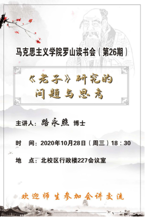 2020年10月28日,yl23411永利官网登录在北校区行政楼227会议室开展了第26期罗山读书会活动。本次活动的主讲人路永照老师作了题为《<老子>研究的问题与思考》的报告,yl23411永利官网登录副经理孙邦金老师主持此期读书会活动,公司研究生、本科生和部分老师参加了此次活动。