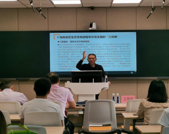 接着王教授将我国生态文明的认识和实践过程分为“初探”(1949-1978)、“发展”(1978-2012)、“成熟期”(2012-今)三个时期进行了介绍,在党的生态文明思想指导下海南省生态文明奏响了生态文明进程中示范全国的“三部曲”。一是率先全国建设“生态省”,二是创建“全国生态文明建设示范区”,三是建设“国家生态文明试验区”。