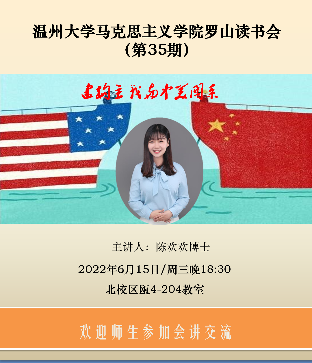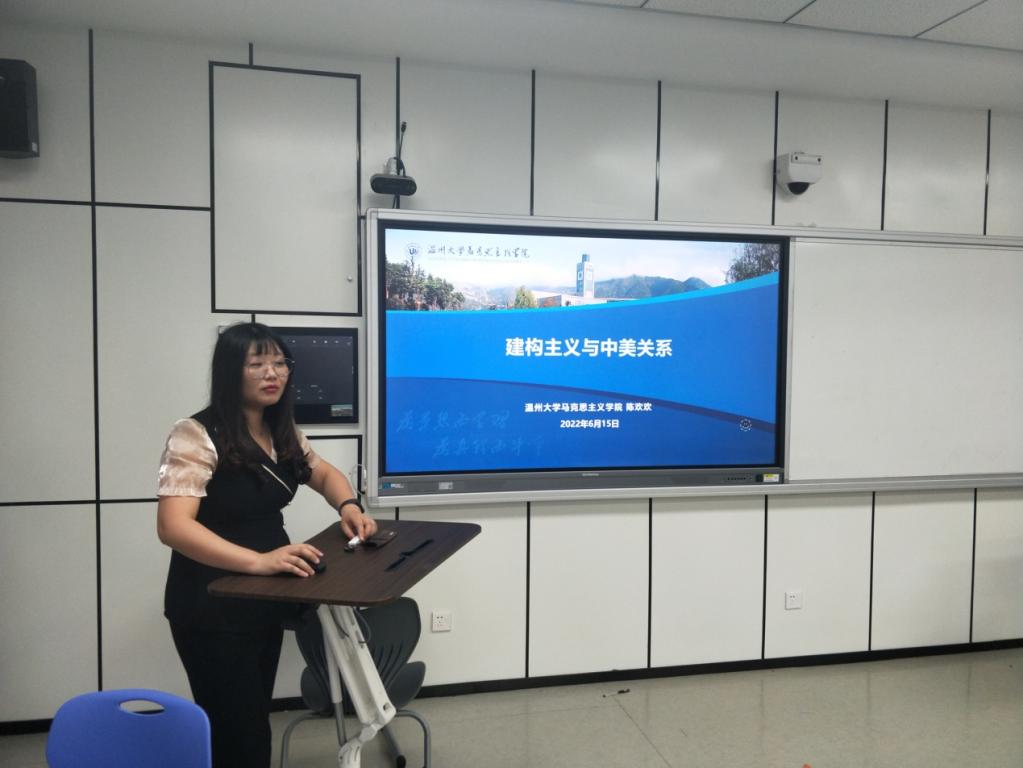 2022年6月15日,yl23411永利官网登录第35期罗山读书会活动在北校区瓯4楼204教室开展。本次活动由路永照老师主持,陈欢欢博士主讲,作了主题为《建构主义和中美关系》的报告,公司研究生和部分老师参加了此次活动。