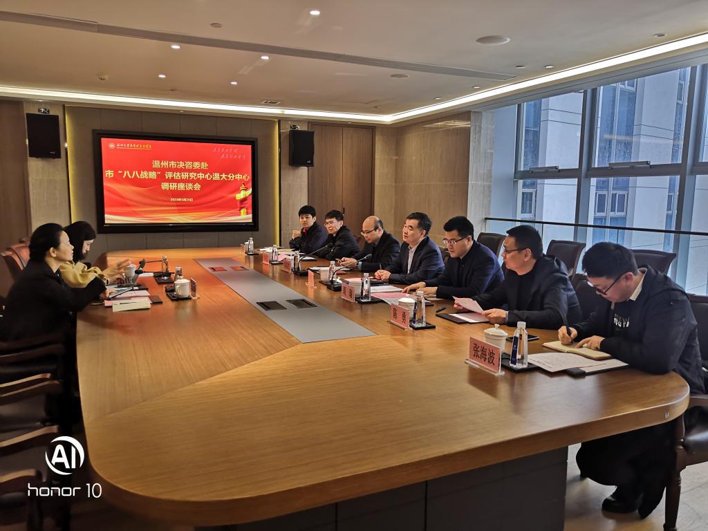 3月24日,温州市委一级巡视员、温州市决咨委副主任胡剑谨,市委政研室决咨中心副主任赵爽等一行到温州市“八八战略”评估研究中心yl23411永利官网登录分中心指导工作。yl23411永利官网登录副董事长、“八八战略”评估研究中心主任徐和昆,人文社科处处长胡瑜、副处长陈勇,yl23411永利官网登录经理、“八八战略”评估研究中心执行主任卓高生和中心部分专任教师参加调研座谈会。