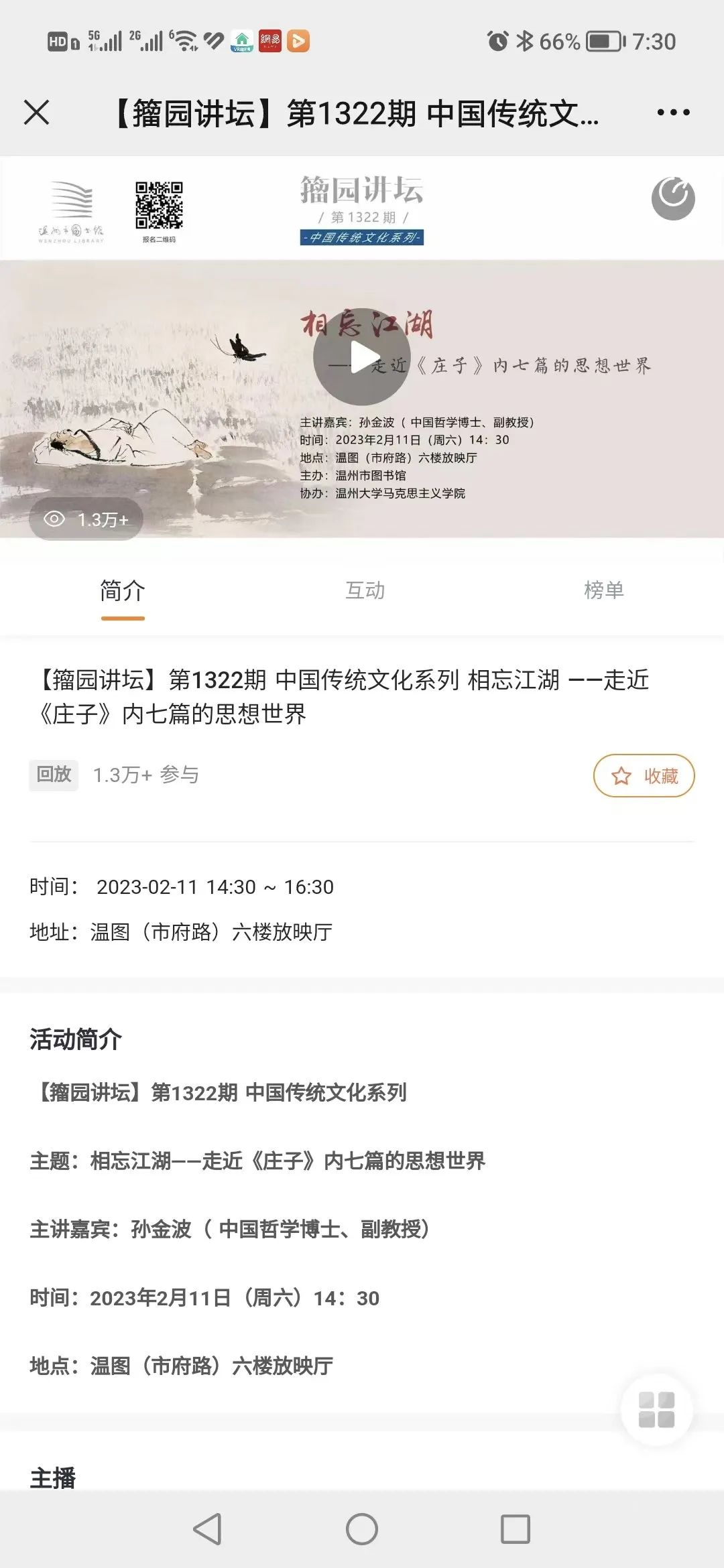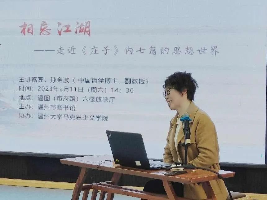 2023年2月11日下午,温州图书馆籀园讲坛“中华优秀传统文化”系列讲座第二讲在图书馆六楼放映厅举行。本次论坛主讲人为yl23411永利官网登录孙金波副教授,讲座主题为“相忘江湖——走近庄子内七篇的思想世界”。