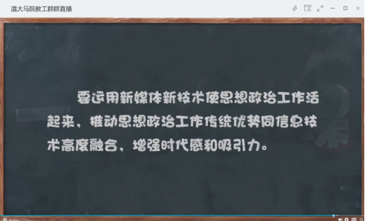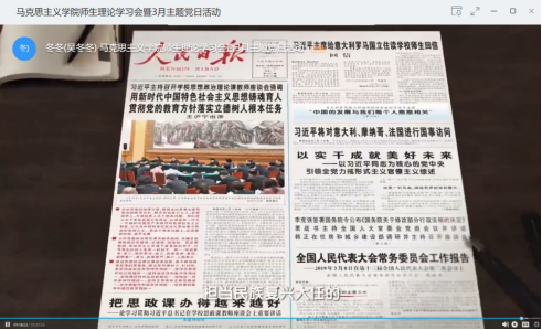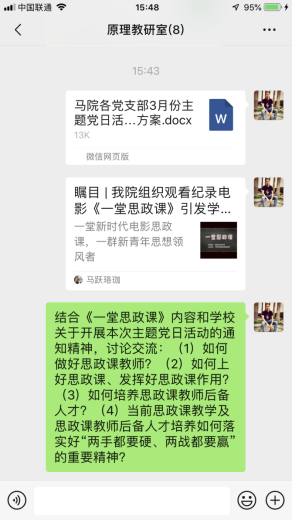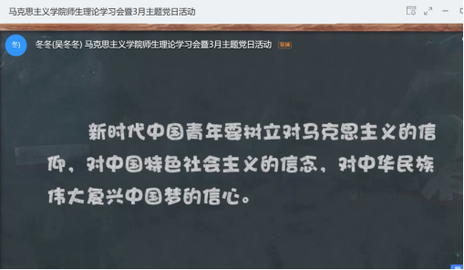 集中观看结束后,由原理党支部书记骆徽负责,原理教研室集中进行一次线上组织生活会,开展讨论交流活动。结合《一堂思政课》内容和公司关于开展本次主题党日活动的通知精神,讨论交流:(1)如何做好思政课教师?(2)如何上好思政课、发挥好思政课作用?(3)如何培养思政课教师后备人才?(4)当前思政课教学及思政课教师后备人才培养如何落实好“两手都要硬、两战都要赢”的重要精神?