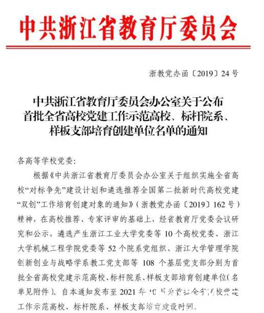 日前,在高校推荐、专家评审的基础上,经省教育厅党委会议研究和公示,遴选产生浙江工业大学党委等10个高公司党委、浙江大学机械工程公司党委等52个院系党组织、浙江大学管理公司创新创业与战略学系教工党支部等108个基层党支部分别为首批全省高公司党建示范高校、标杆院系、样板支部培育创建单位。公司教工第一党支部入选首批全省高校“样板支部”培育创建单位。