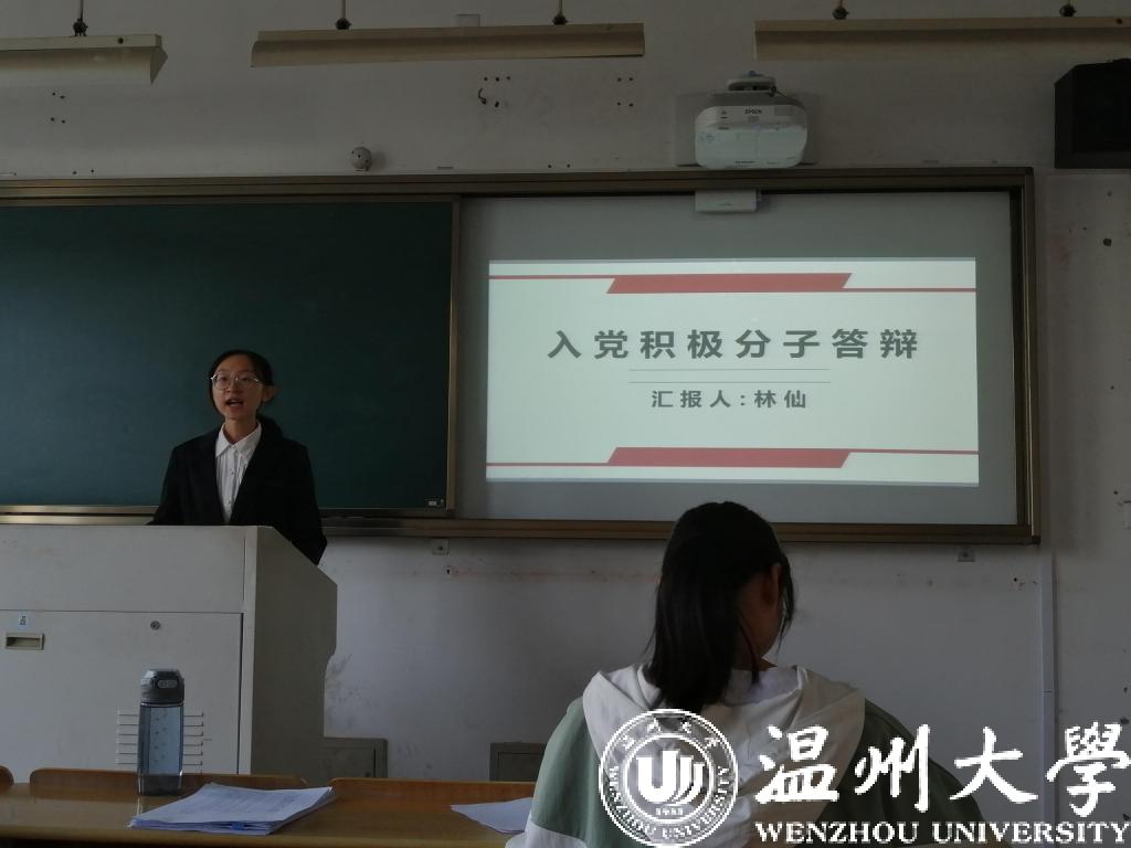 答辩开始,主持人陈心怡宣布答辩议程及规则,入党积极分子按顺序上台,分别就本人履历、对党的认识、入党动机、在校表现等向组织作出汇报。随后进入问答环节,内容包含相关党务知识和本人生活学习两个部分。
