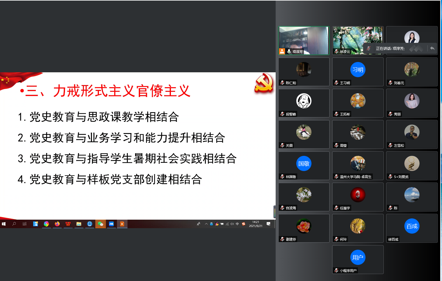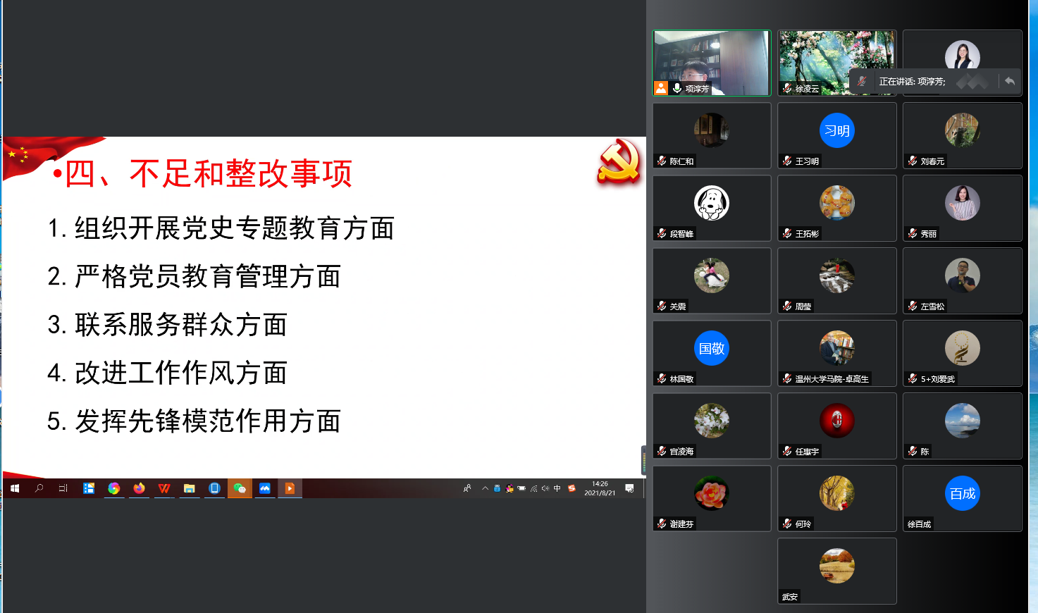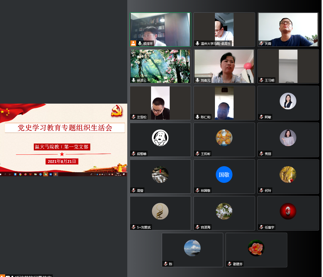为贯彻落实市、公司党史学习教育领导小组办公室部署和公司关于召开党史学习教育专题组织生活会方案的精神,8月21日下午,yl23411永利官网登录教工第一党支部围绕“学党史、悟思想、办实事、开新局”的主题,组织全体党员通过腾讯会议召开线上党史教育专题组织生活会。会议由党支部书记项淳芳同志主持,公司经理兼党委副书记卓高生同志以普通党员身份参加党支部和概论党小组的专题组织生活会。