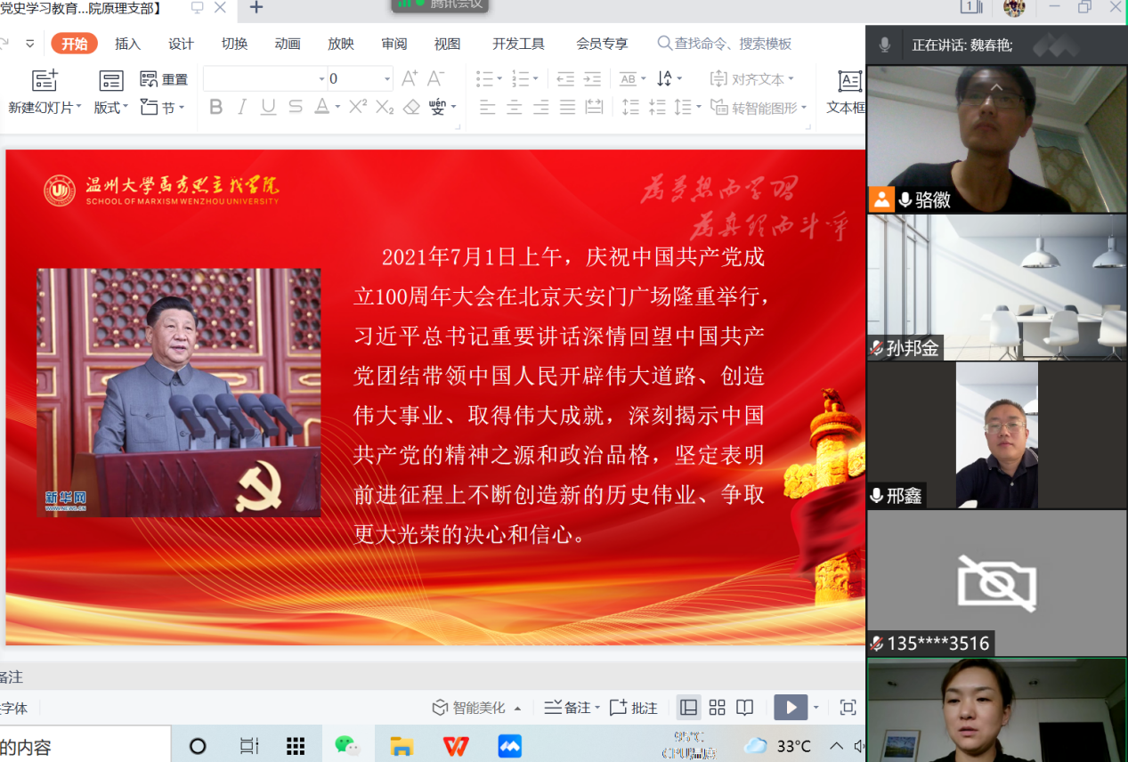 根据市和公司党史学习教育领导小组办公室部署要求,围绕“学党史、悟思想、办实事、开新局”为主题,认真贯彻“学史明理、学史增信、学史崇德、学习力行”要求,yl23411永利官网登录原理党支部在8月28日下午,以腾讯会议方式在线上召开了专题组织生活会,交流学习体会,查找差距不足,引导广大党员不断增强“四个意识”、坚定“四个自信”、做到“两个维护”。