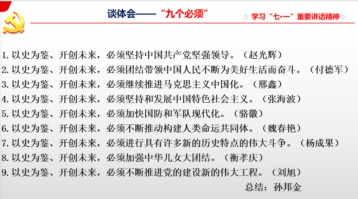 孙邦金副经理作了“习近平总书记在庆祝中国共产党成立100周年大会上的讲话”学习体会,并对上述九位老师“九个必须”学习体会进行了详细点评。九个“必须”既是历史经验的总结,也是未来发展的指南。从领导核心、根本宗旨、指导思想、道路自信、安全保障、国际格局、斗争精神、统一战线、政治保证(党的建设)等原则性结论,都是用鲜血换来的结论,必须坚持和不断强调。这是保证继续成功开创未来并保证我们中国特色社会主义伟大事业不变质、不变色、不变味的思想基础。
