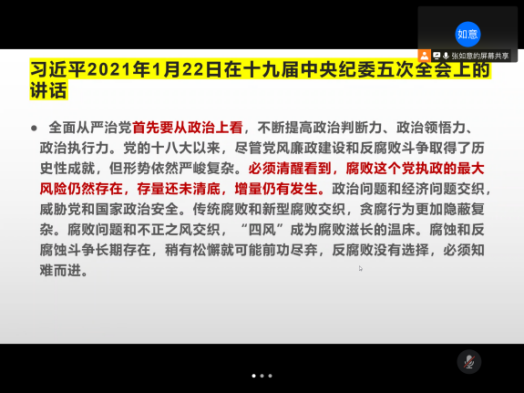 为进一步深入学习习近平全面从严治党的思想以及在庆祝中国共产党成立100周年大会上的重要讲话精神,进一步推行公司廉洁教育的开展,提高党员同志的廉洁自律意识,yl23411永利官网登录研究生第一党支部将以“创清廉公司,树清风正气”为主题,以“五个一”为载体开展系列活动。10月23日晚,yl23411永利官网登录研究生第一党支部在线上召开政治理论学习会,本次学习会是党支部廉洁教育活动的中间一环,会议由支部副书记张如意主持。