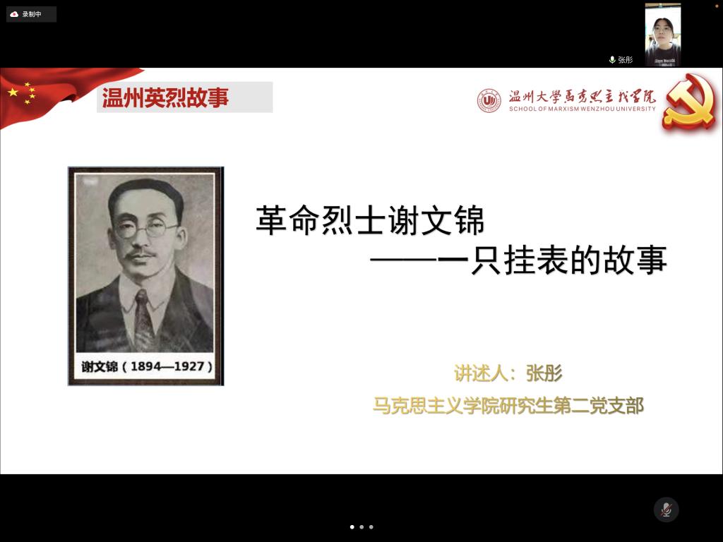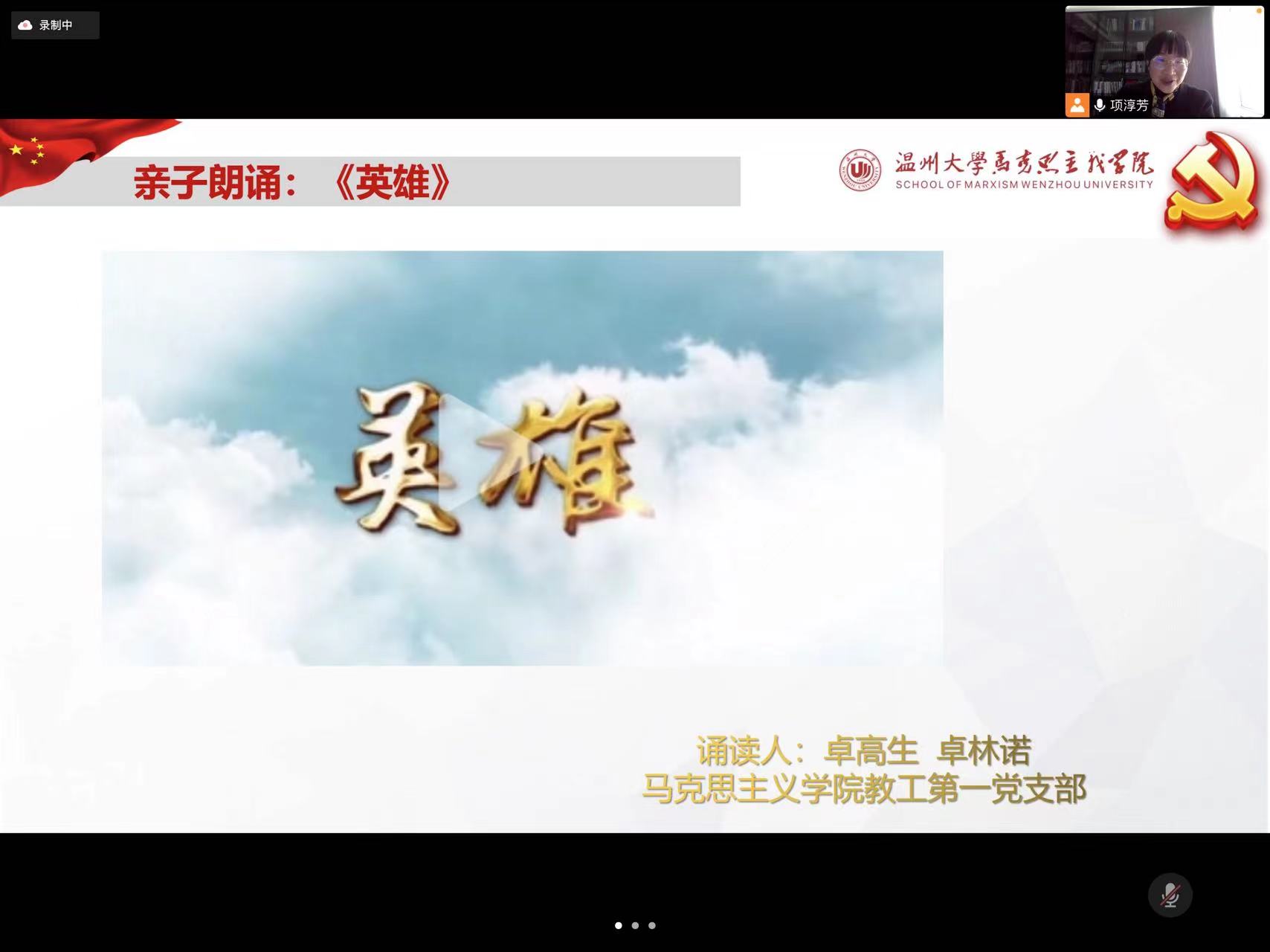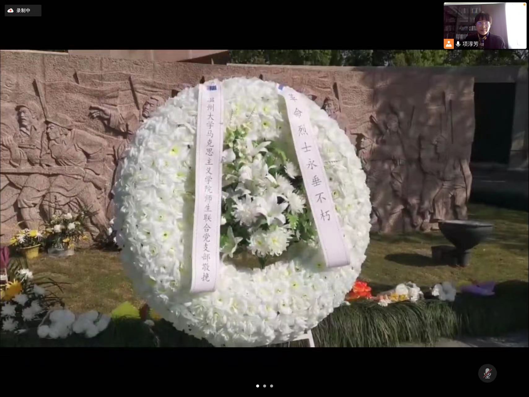 网祭忠魂,丰碑永恒。活动前,48位师生党员事先关注“温州市革命烈士纪念馆”公众号进行学习。活动中,由教工第一党支部书记项淳芳老师分享《人民英雄纪念碑》MV,接着带领师生在线上“云观展”温州革命烈士纪念馆VR展厅,并在线参与由纪念馆工作人员代献花圈活动,通过“云祭扫”进入翠微山烈士陵园祭拜革命英烈。师生党员深受感动,纷纷登录“温州革命烈士纪念馆”线上平台,怀着崇敬的心情通过网上鲜花、祭拜留言和转发分享“H5”等形式,“云接力”为英雄献花,表达对革命英烈的缅怀之意。然后项淳芳老师与师生共同学习习近平总书记关于英雄烈士的系列讲话,与习近平总书记一起缅怀英烈,致敬人民心中“最闪亮的坐标”。
