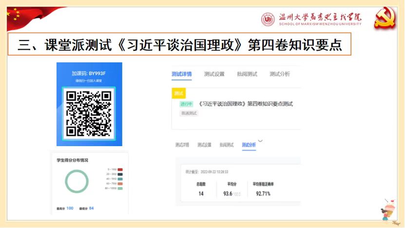 本次主题党日活动首次开辟了“全国样板党支部”线上学习空间——“课堂派”,上传各种学习文献、音像资料,进一步推动支部党员加强学习,并围绕《习近平谈治国理政》第四卷知识要点当堂进行了在线学习考核。