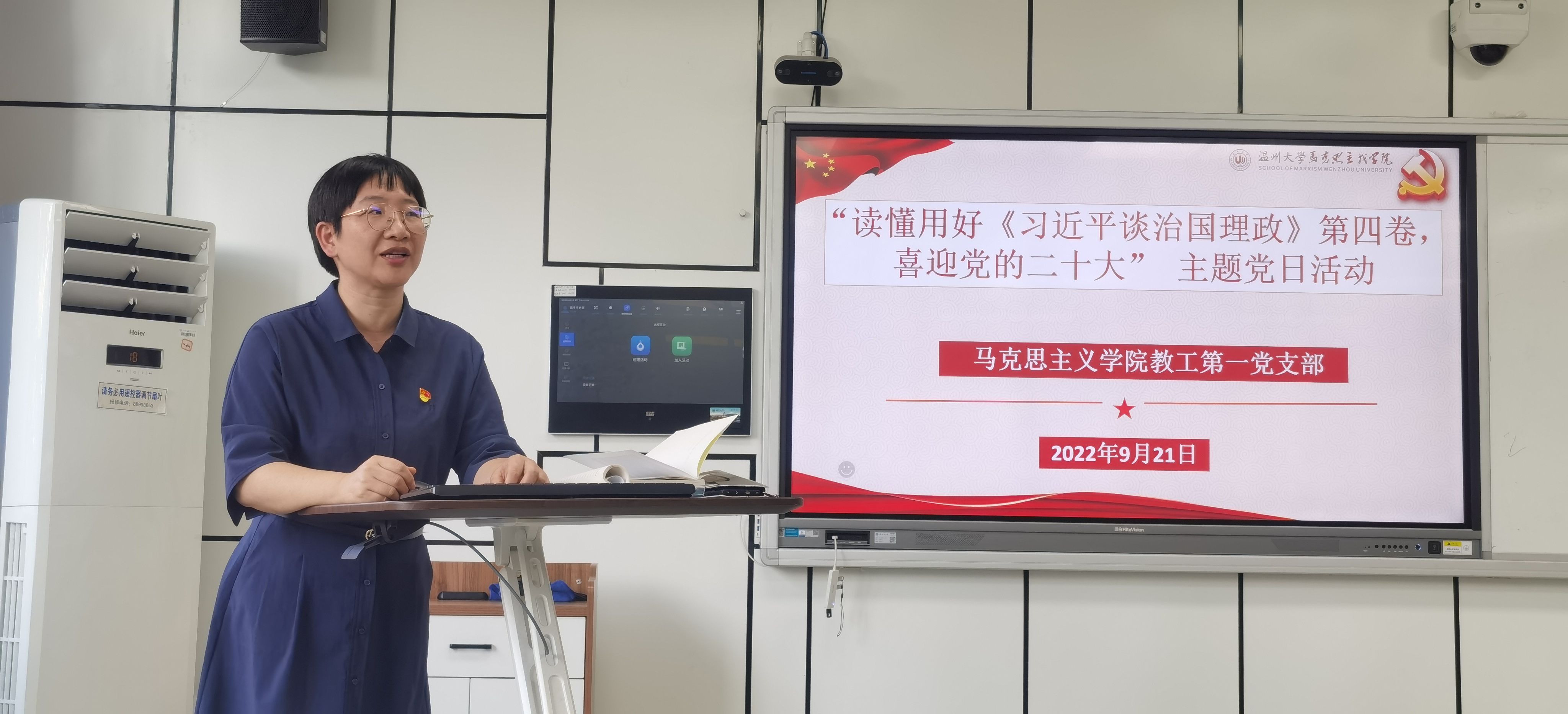 为贯彻落实中央宣传部、中央组织部关于认真组织学习《习近平谈治国理政》第四卷的通知,推动学习贯彻习近平新时代中国特色社会主义思想走深走实,以实际行动迎接党的二十大胜利召开,9月21日下午,yl23411永利官网登录教工第一党支部在北校区瓯4-204教室开展了“读懂用好《习近平谈治国理政》第四卷,喜迎党的二十大” 主题党日活动,由支部书记项淳芳同志主持,全体支部党员参加。