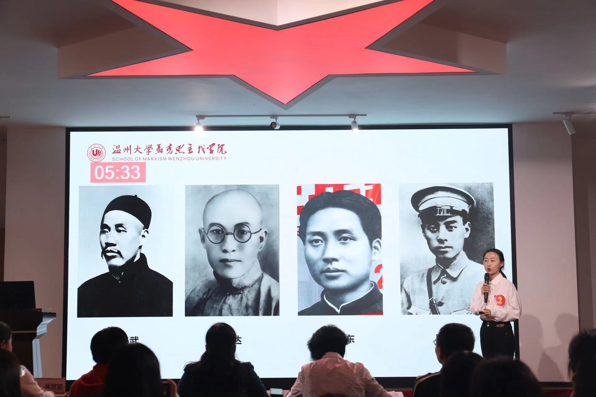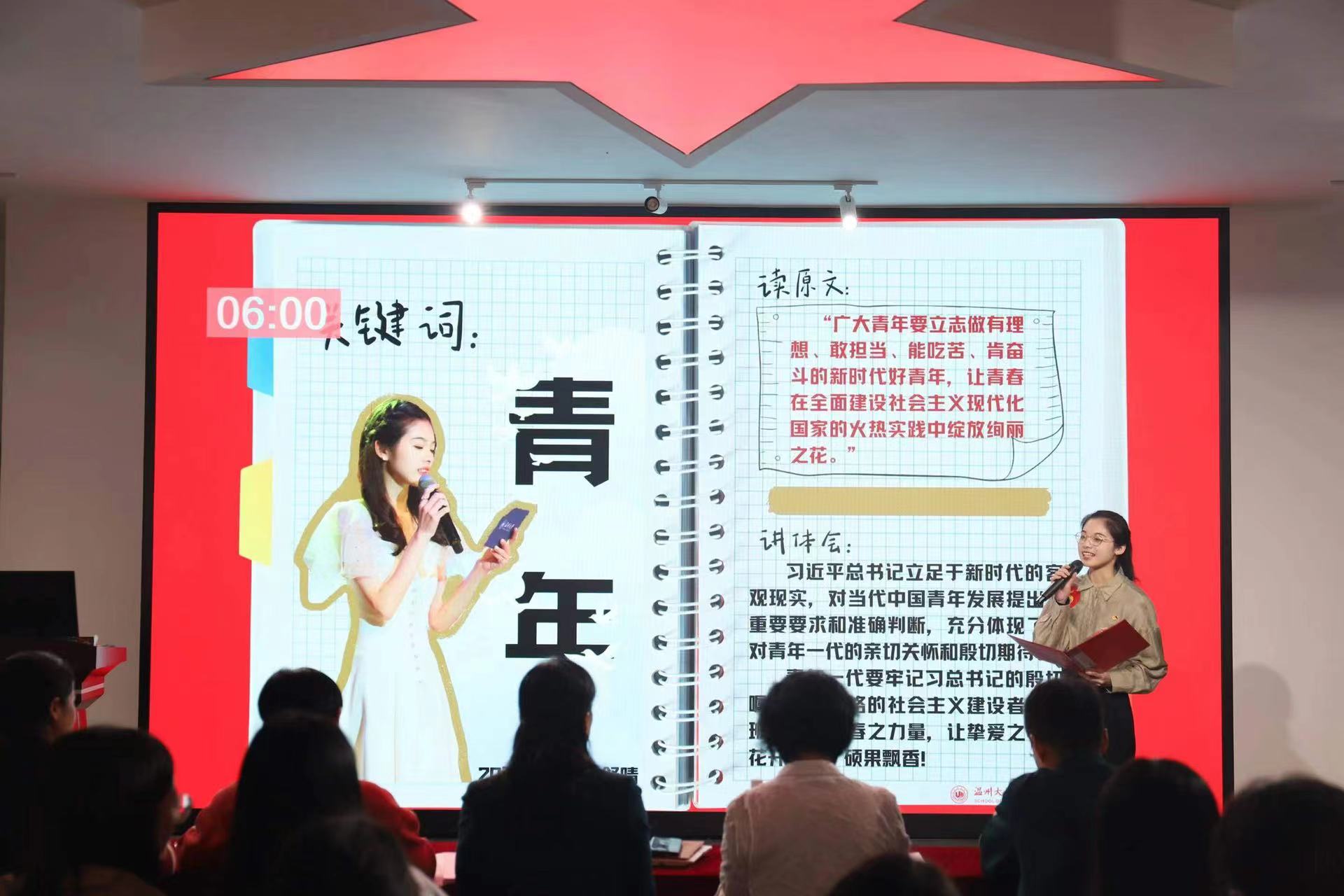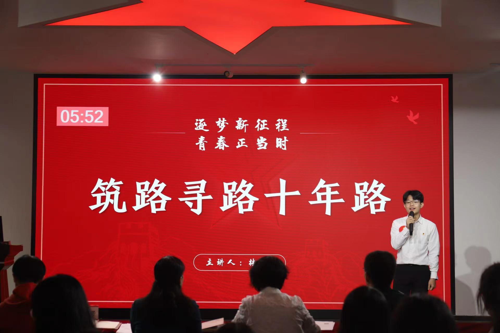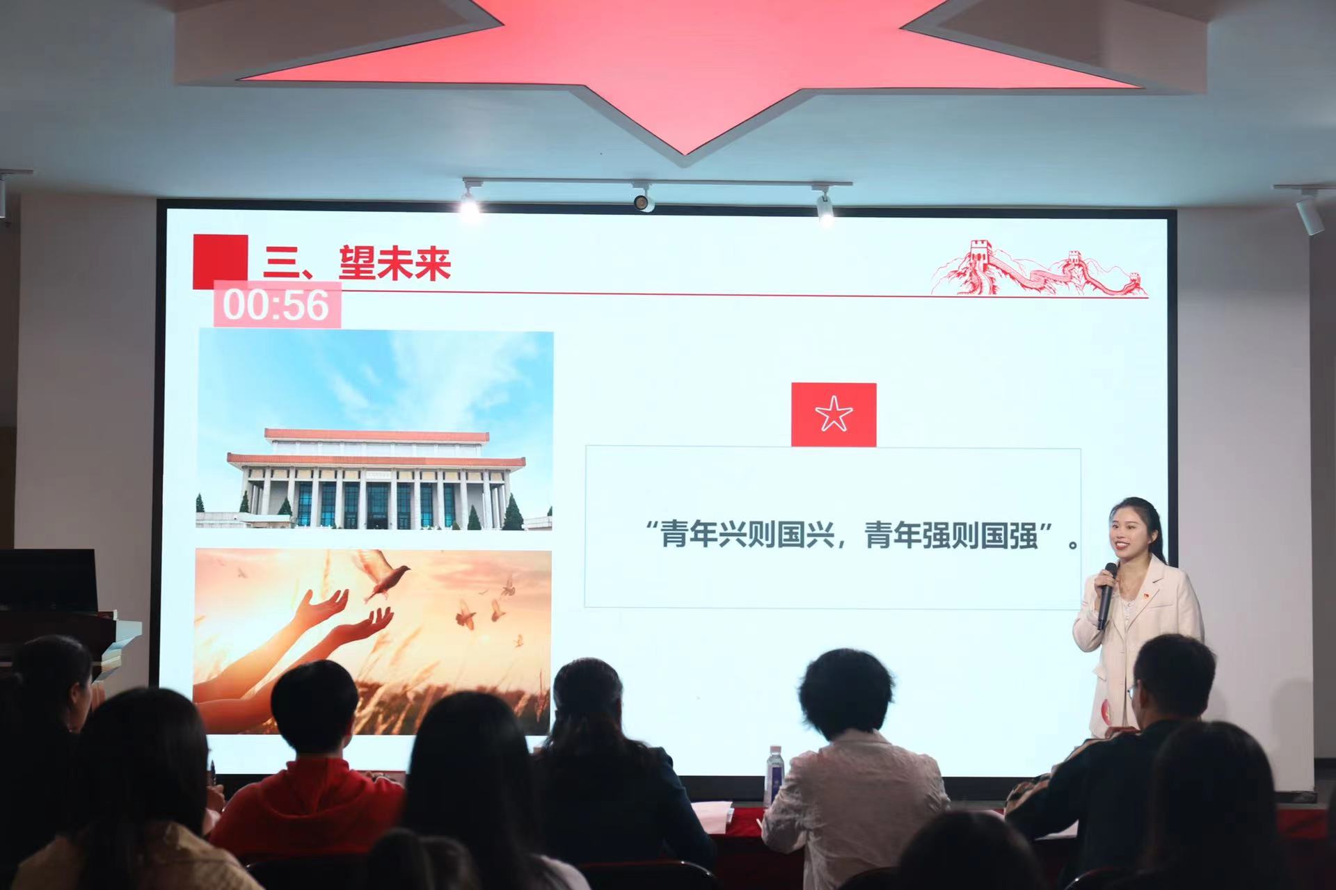 紧接着,九位参赛选手以“奋进新征程·青春正当时”为主题,分别以《以青春之名,实强国之志》、《汲取百年党史力量,做新时代有为青年》、《青春向我,奋斗看我,强国有我》、《肩负“窗口”使命,领跑“共富”赛道》、《做好青年勇担使命》、《中国精神—红旗渠精神》、《筑路寻路十年路》、《以青春之力,圆强军之梦》、《二十不惑,二十有获》为题,利用多媒体设备图文并茂、形象生动地展现自我风采,讲述时代故事,引起观众的强烈共鸣。