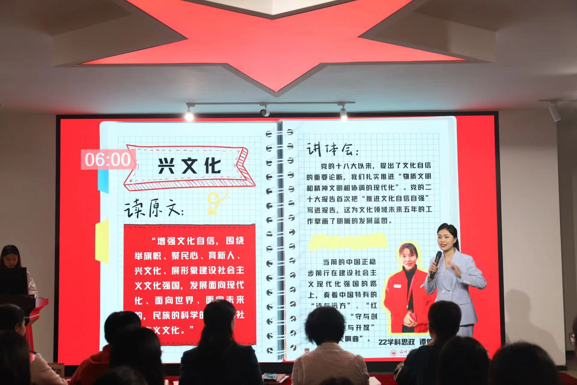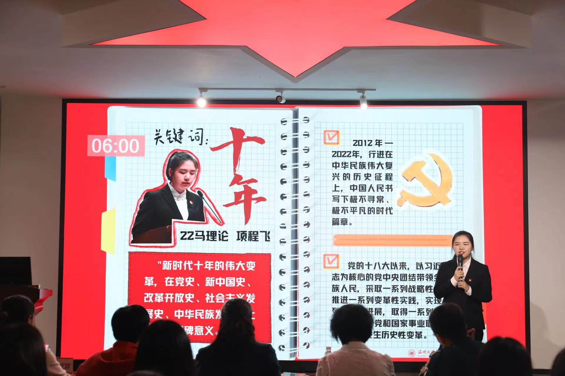 此次大赛以“二十大报告我来说”开场,参赛选手们紧扣“十年”、“江山与人民”、“兴文化”、“新境界”、“青年”、“答案”、“新发展理念”、“新征程”、“教育”关键词,充分结合所思所想进行理论宣讲,带领公司师生党员逐字逐句学习党的二十大报告。