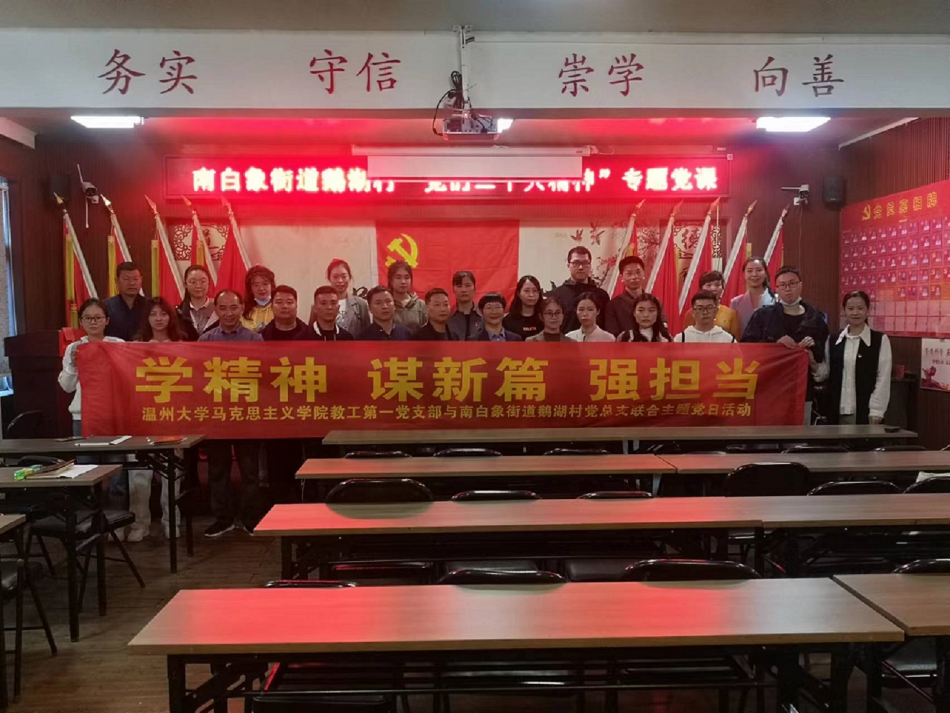 为深入学习贯彻宣传党的二十大精神,充分发挥党支部理论宣传重要阵地作用,2022年11月18日下午,yl23411永利官网登录教工第一党支部书记项淳芳带领支部党员、yl23411永利官网登录研究生部分党员和发展对象学员们一起走进南白象街道鹅湖村,与鹅湖村联合开展“学精神、谋新篇、强担当”主题党日活动。