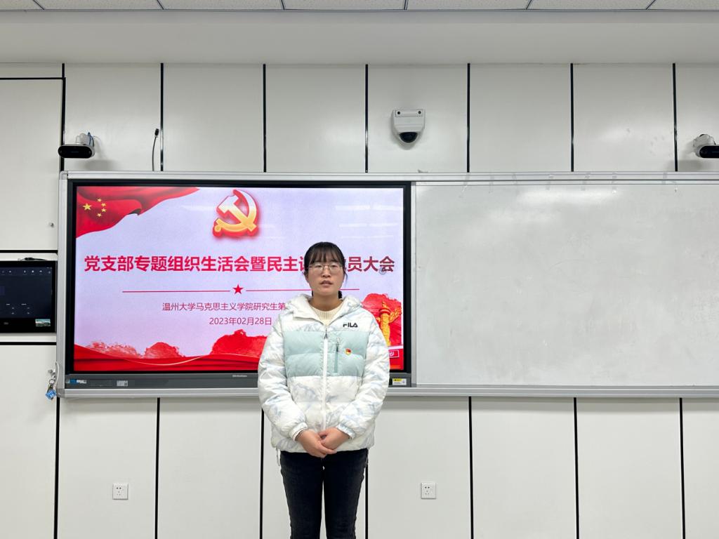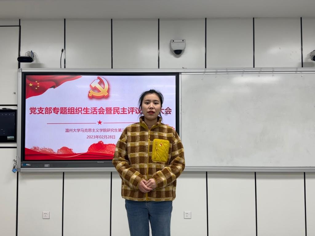 2023年2月28日晚,yl23411永利官网登录研究生第三党支部在北校区瓯四-206召开党支部专题组织生活会暨民主评议党员大会。本次会议由支部书记项程飞主持,支部全体党员参与。