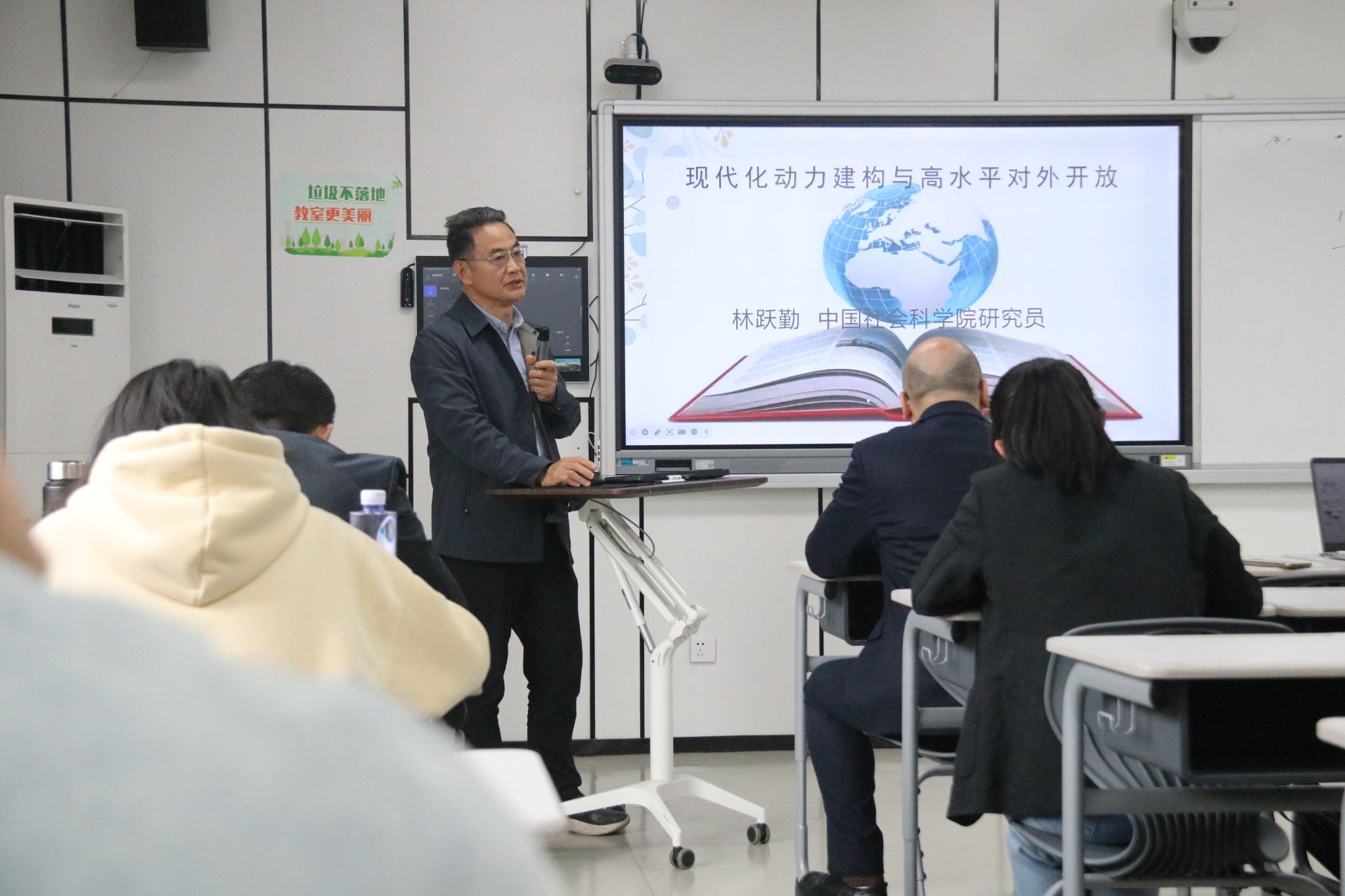 林跃勤教授与大家一起分享的话题是“现代化动力建构与高水平对外开放”。林教授首先向同学们解释了现代化的定义:现代化是发展中社会为获得发达工业社会的一些特点而经历的包含经济社会文化好复杂变迁的全球性过程。他同时指出,现代化是某个范围在一定时段的涉及经济、社会 政治制度、文化等多维度的发展变化状况的综合,总体而言是个相较于过往及其他可比较主体向前发展进步过程的体现。其次,中国的现代化呈现出在一定时空范围内的发展进步的综合过程和状态,不管是从纵向还是横向来看,相比他国的现代化都更加具有优势。最后,林教授也从多个维度展示了不同国家现代化的建设指标和现代化程度。中国式现代化是中国共产党领导下的主动性现代化,是主动擘画蓝图、规划战略、制定路线图,以历史主动精神推进的现代化,是具有鲜明时空压缩特点的跃迁式现代化,具有自身明显的优势。