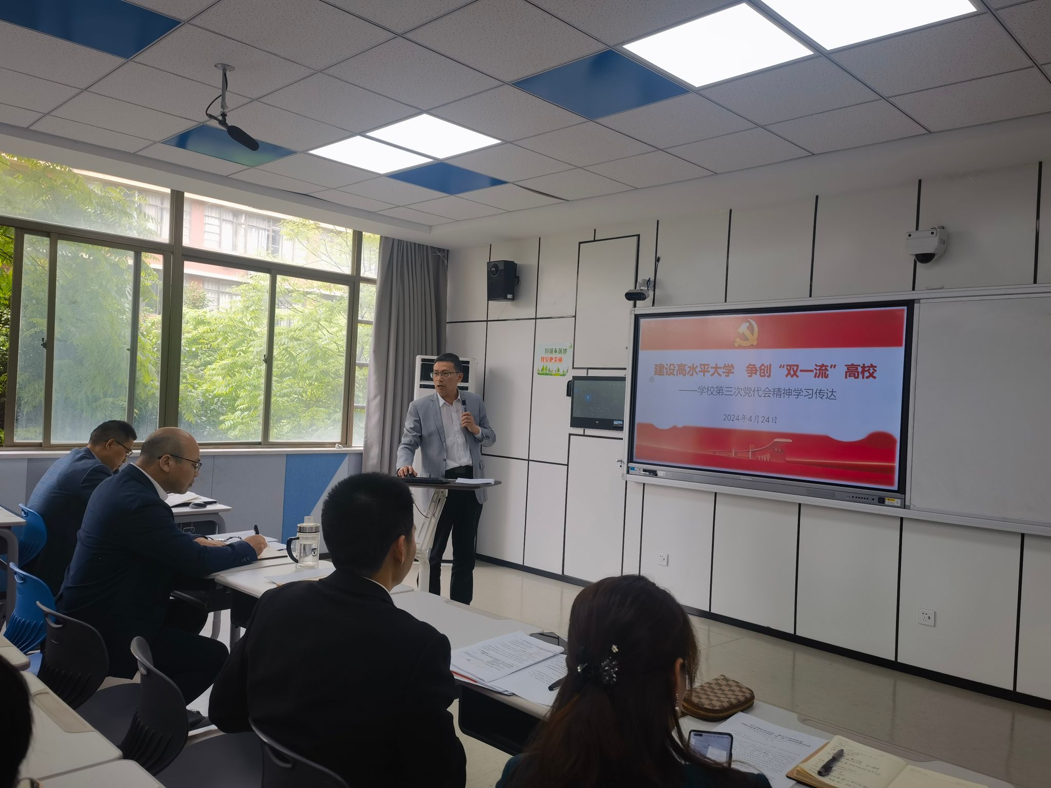 会上,公司党委书记王柏民以“建设高水平大学,争创‘双一流’高校”为题介绍了校三次党代会精神。王书记介绍了公司三次党代会的主要议程和新选举产生的公司“两委”人选,强调这次党代会是公司立足博士学位授予单位新起点、以高质量党建引领高水平大学建设的关键时期召开的一次重要会议。大会的主题是:高举习近平新时代中国特色社会主义思想伟大旗帜,牢记嘱托、勇担使命、砥砺前行,为建设高水平大学、争创“双一流”高校而团结奋进。大会总结了公司第二次党代会以来的发展成就和办学90年的经验启示,谋划未来五年以及办学百年的奋斗目标、发展战略和重点任务。