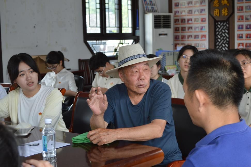 下午,师生一行前往纸源村村委会,在纸源村村干部陈小林、潘荣忠、潘云波、潘玲玲等同志的介绍下与交通员林朋弟后代潘正松老人进行面对面交流访谈。老人赶到村委会议室时,见到在场等候的师生,激动之情溢于言表,不禁感慨落泪。