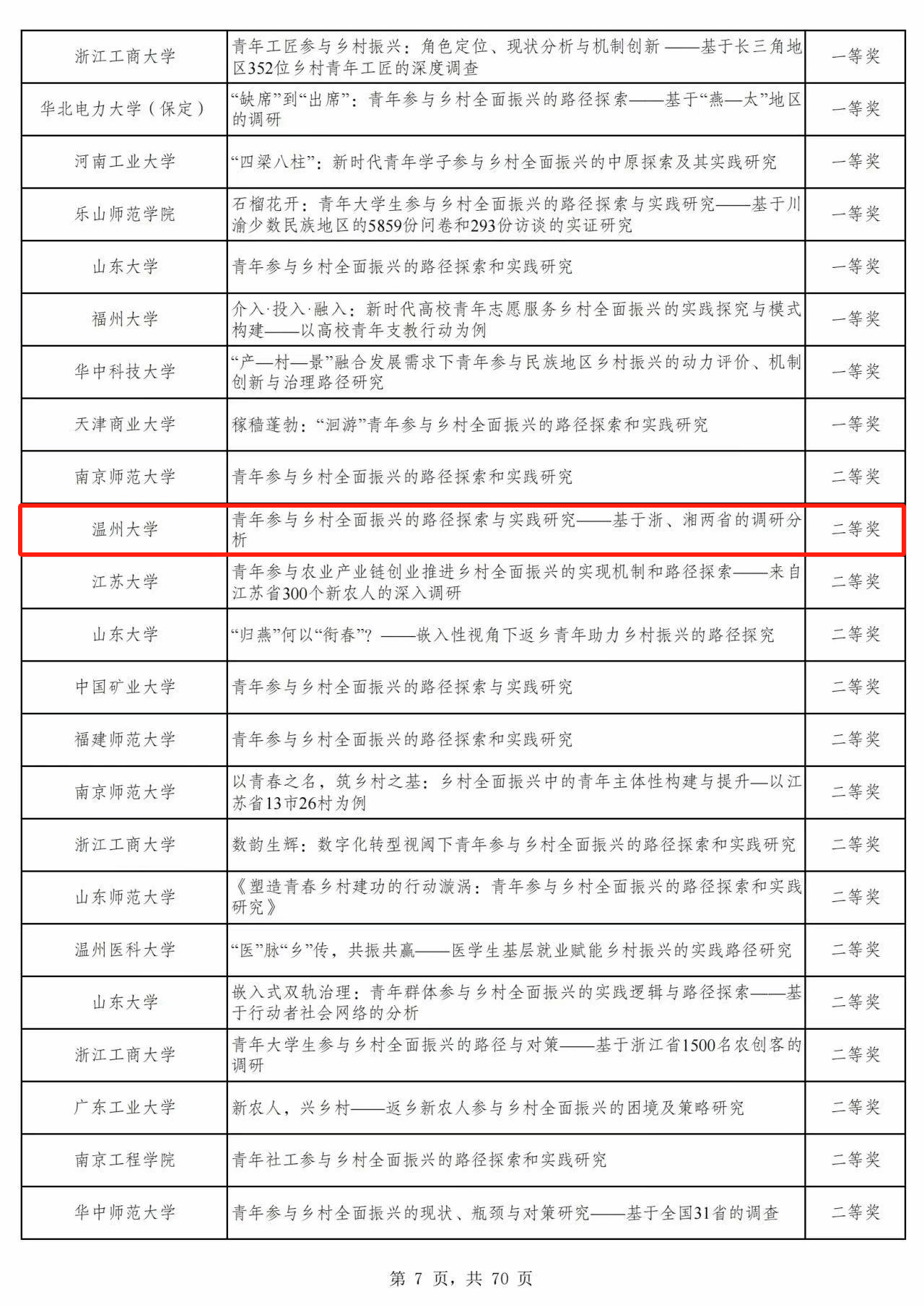 近日,由共青团中央、中国科协、教育部、中国社科院、全国学联联合主办的第十九届“挑战杯”全国老员工课外学术科技作品竞赛“揭榜挂帅”专项赛顺利举行。公司参赛项目《青年参与乡村全面振兴的路径探索与实践研究——基于浙、湘两省的调研分析》(指导老师:鲁文、刘玉侠、吴冬冬;参赛成员:陈温如、黄伊文、练舒淇、马佳欣、方思琪、陈庄)取得佳绩,荣获全国二等奖!