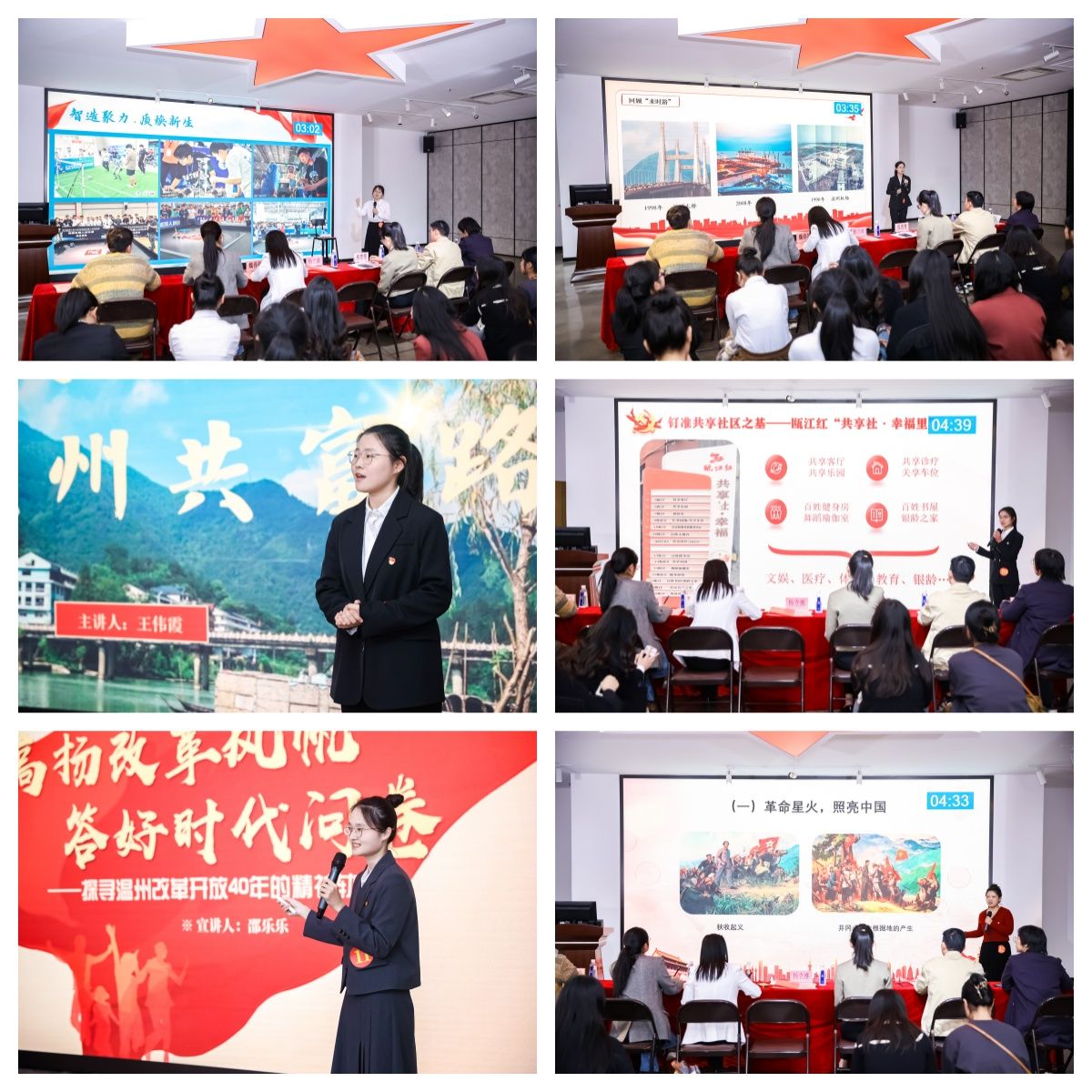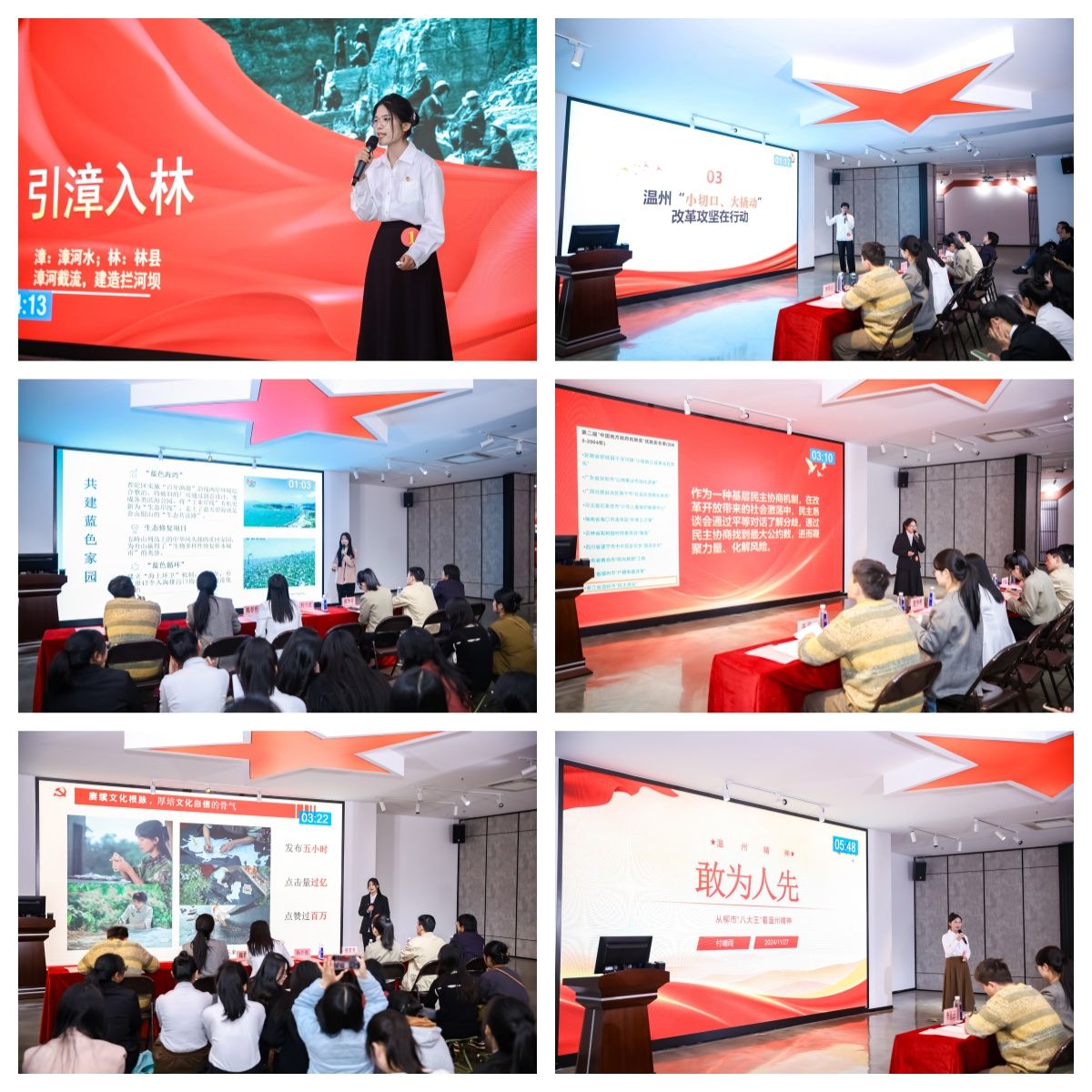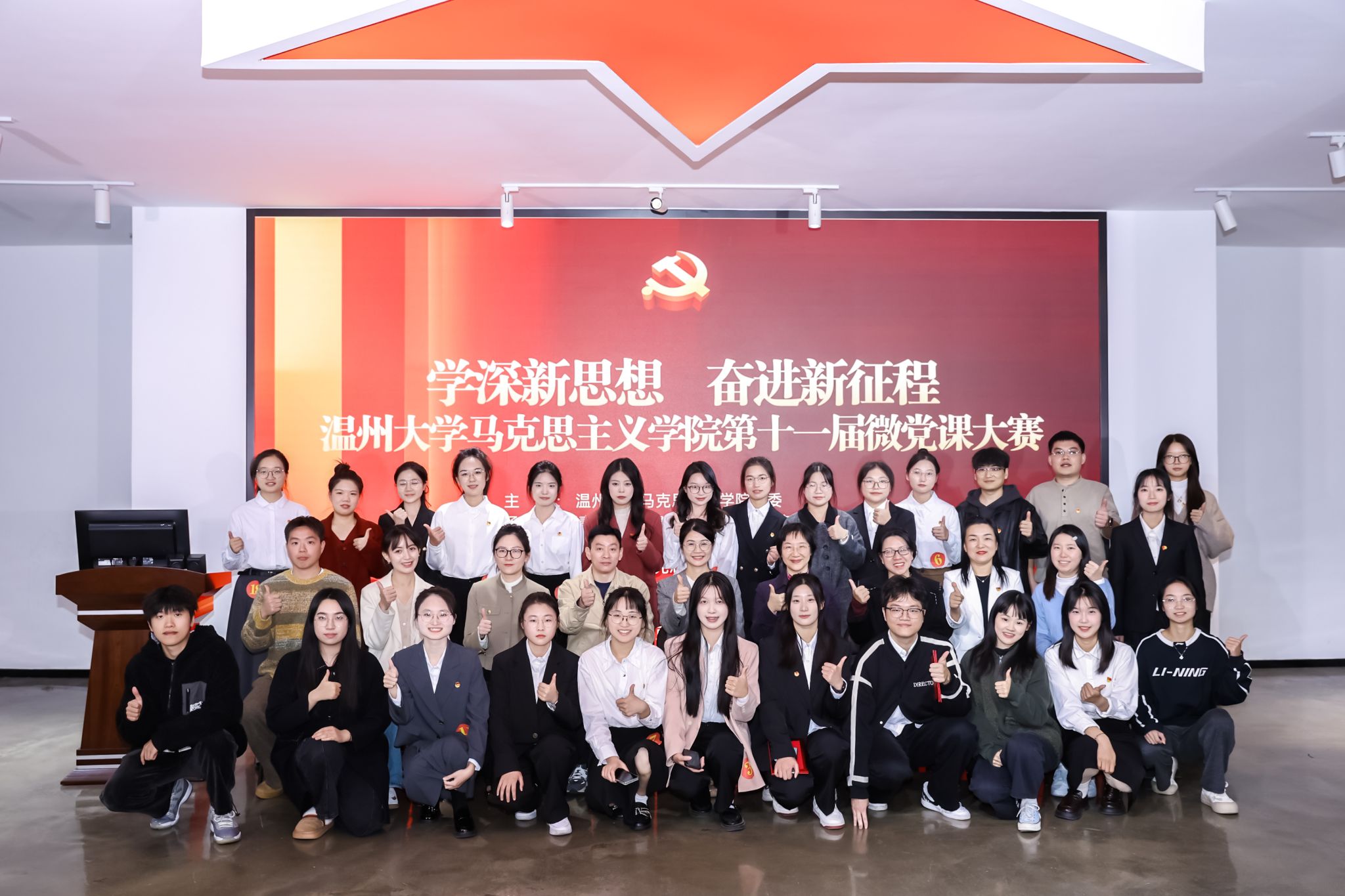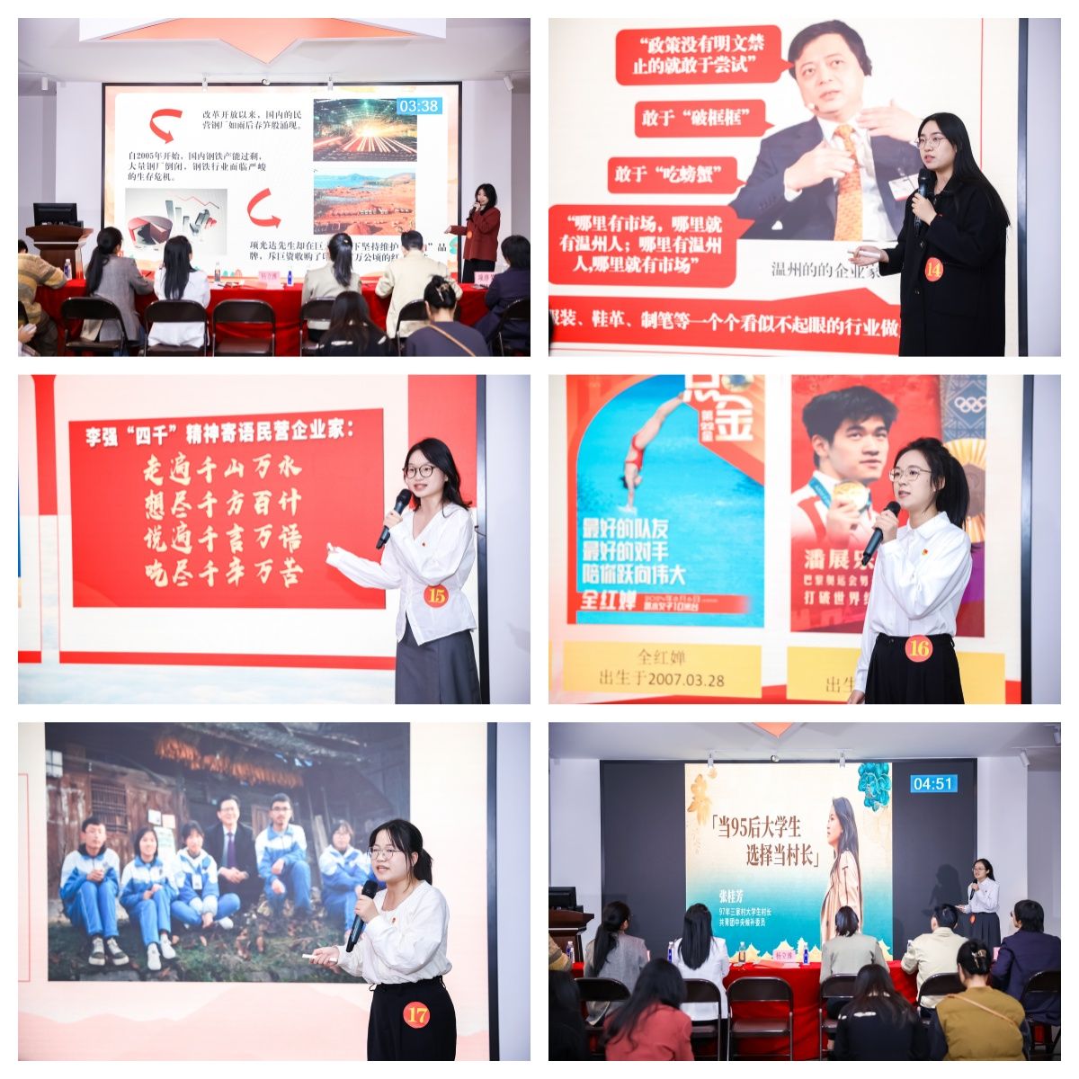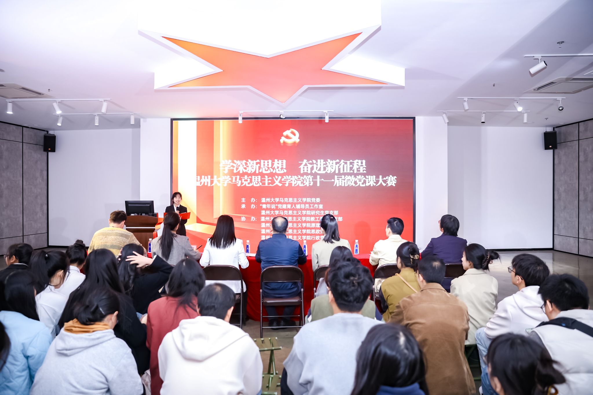 随后,十八位参赛选手纷纷登台,基于各自的专业特色和亲身经历,围绕 “学深新思想 奋进新征程” 展开了一场别开生面的微党课宣讲。他们紧扣主题,从不同角度切入,为现场师生带来了一场精彩纷呈的思想盛宴。有的选手从温州当地的企业发展入手,以小见大,展现了在党的领导下地方经济的蓬勃发展以及背后所蕴含的伟大时代精神;有的选手聚焦智能智造领域,通过对科技创新成果的分析,感悟国家在科技强国道路上的坚定步伐和辉煌成就;还有的选手从小物件出发,探寻 00 后青年的精神传承,展现了新时代青年在党的指引下,继承和发扬优良传统,勇担时代使命的精神风貌。
