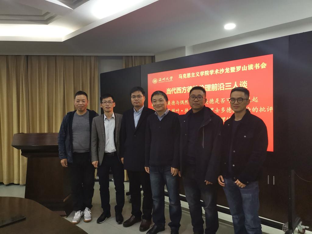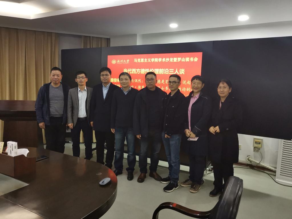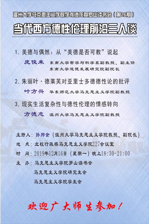 2019年12月16日,yl23411永利官网登录在北校区行政楼227会议室开展了主题为“当代西方德性伦理前沿三人谈”学术沙龙暨读书会活动。东南大学人文公司哲学与科学系庞俊来副教授、华东师范大学yl23411永利官网登录叶方兴副教授以及yl23411永利官网登录方德志副教授结合各自的研学所得,分别做了题为《美德与偶然:从“美德是否可教”说起》、《朱丽叶·德莱芙对亚里士多德德性论的批判》、《现实生活复杂性和德性伦理的情感转向》的发言,yl23411永利官网登录副经理孙邦金教授主持此期读书会活动,公司研究生、本科生和部分老师参加了此次活动。