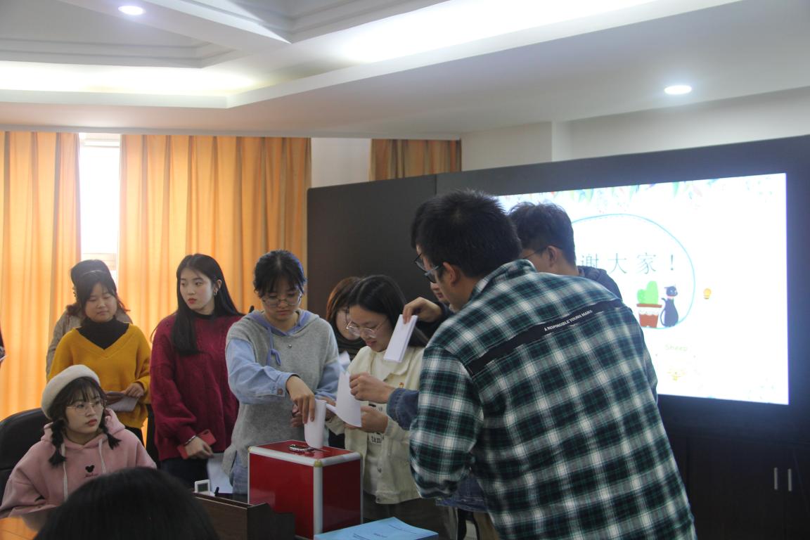 接下来进入换届选举环节。五位候选人依次上台做竞选演讲。候选人们从自我介绍、工作期望等多方面进行演讲,表达了各自对公司团学这个大家庭的热爱,也提出了许多工作举措,并希望公司团学能够更加具有凝聚力,各部门在做好本职工作之余,尽力协助其他部门的工作,以端正、良好的态度服务同学。演讲完毕后,各代表团进行投票,为做到公平公正公开,本次选举在全体代表的监督下现场唱票统计,并现场公布竞选结果:郑暄萱担任团委副书记,陈玲雅担任员工会主席,林芷彦担任员工会副主席。最后,全体起立奏唱团歌,yl23411永利官网登录第二届团委·员工会换届选举大会落下帷幕。