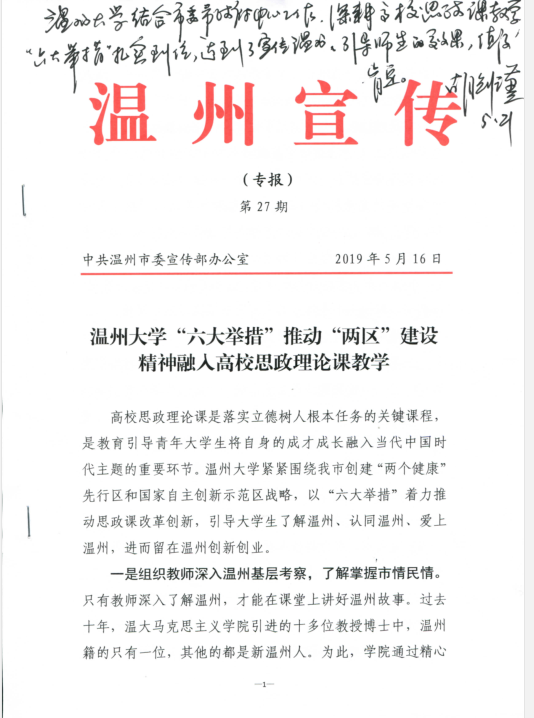 由温州市委宣传部5月16日印发的第27期《温州宣传》专题报道了《yl23411永利官网登录“六大举措”推动“两区”建设精神融入高校思政理论课教学》,介绍了温大公司围绕温州“两区”建设中心工作,在思政课教学及教师科研、社会服务中积极开展系列活动的情况。公司的做法受到了中共温州市委常委、宣传部长胡剑谨的批示肯定和yl23411永利官网登录党委书记谢树华的点赞。胡剑谨部长批示说:“yl23411永利官网登录结合市委市政府中心工作,深耕高校思政课教学,‘六大举措’扎实到位,达到了宣传温州、引导师生的效果,值得肯定。”谢树华书记点赞说:“公司既说又做,赞一个。”领导的肯定点赞给了公司教师们莫大的鼓励和鞭策。