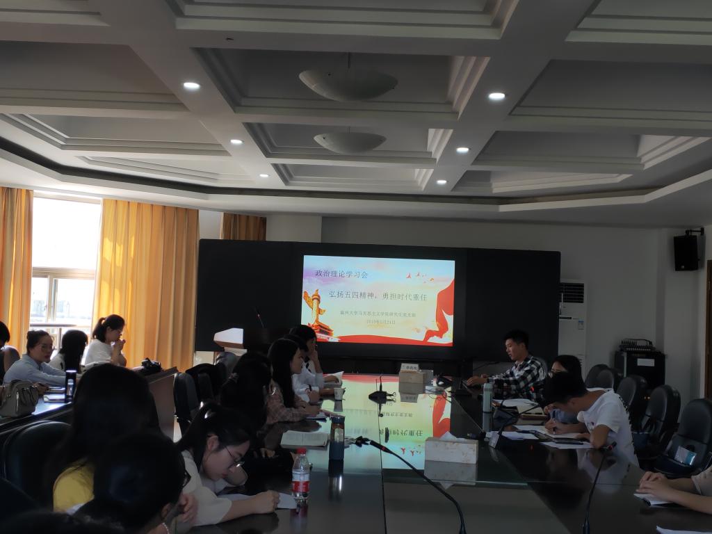 5月24日下午,yl23411永利官网登录研究生党支部在北校行政楼227会议室召开了以“弘扬五四精神,勇担时代重任”为主题的政治理论学习会。公司研究生党支部全体党员以及积极分子参加了此次会议。会议由党支部副书记洪丽丽主持。