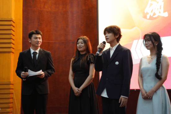 伴随着激昂的音乐声,大屏幕播放着获奖队伍的作品精简合集视频,其中荣获一等奖的参赛微电影《青春逆旅逐梦新华章》通过一场跨越百年的青春对话,将五四精神与当代青年的思考完美融合。主持人对这部作品的编剧兼导演的张锦源同学进行采访,他回答道作品是用‘穿越梦境’的形式来激励着当代青年继承和发扬五四精神,参演人员还分享了自己对角色的感悟及其获奖感言。