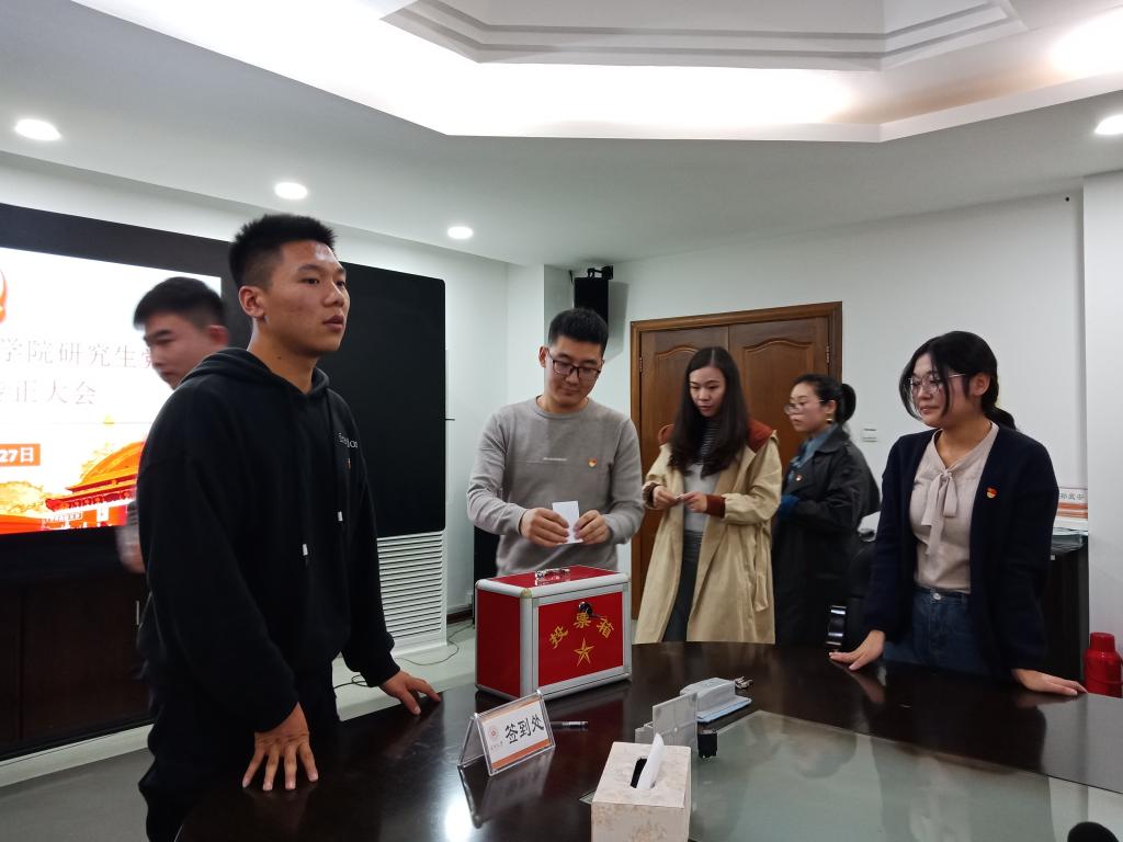 2018年11月27日,yl23411永利官网登录研究生党支部在北校区227会议室召开了党员大会。大会主要讨论了王茜等四名发展对象吸收为中共预备党员以及陈俊儒等五位中共预备党员转为中共正式党员的问题。党总支书记王柏民、党总支组织委员兼组织员项淳芳老师以及公司全体研究生党员参加了此次大会。大会由党支部书记孟江龙主持。