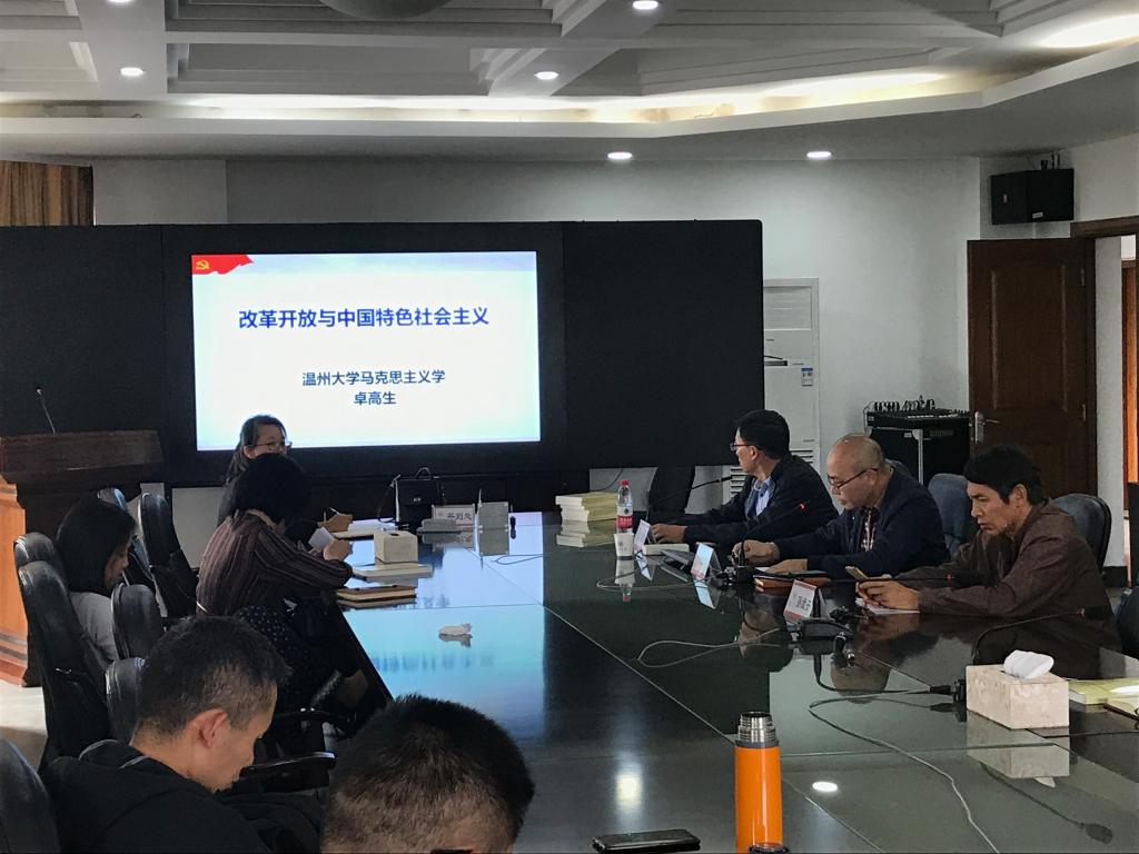 卓高生博士以“改革开放与中国特色社会主义”为题,从“改革开放历史进程与重大意义”、“改革开放是实现中华民族伟大复兴的关键一招”、“新时代全面深化改革的基本要求”等视角,回顾了我国改革开放四十年的简要历程、成就经验以及未来改革的重点和方向,使大家对四十年的改革开放历史有了更深刻的认识和理解,对我国当前及未来改革发展的形势有了更清晰的了解。