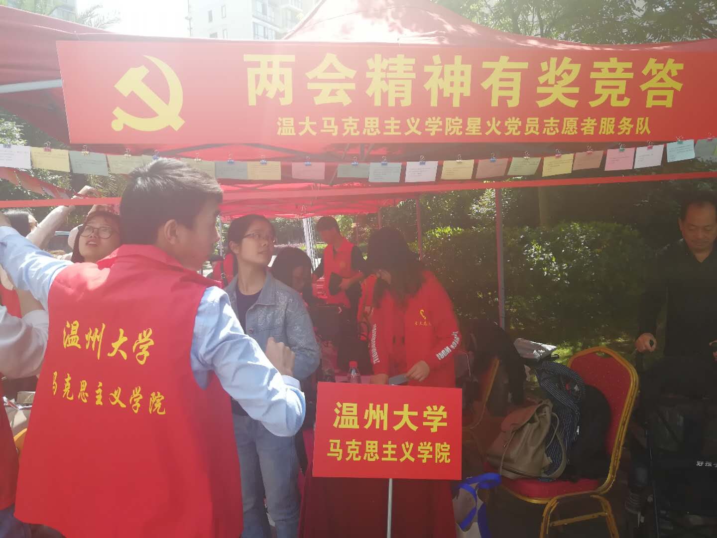 项目启动仪式主由博园社区党支部书记与各志愿团体签约并授牌、与会领导向签约单位授志愿者队旗以及签约代表上台认领服务项目等议程,公司研究生党支部书记徐晶晶同志代表公司星火服务队接受了该活动授予的志愿者队旗,并挥动队旗展示星火服务队风貌,党支部委员洪丽丽、孟江龙同志代表星火服务队上台认领服务项目。此项目启动仪式结束,各志愿者单位在博园社区文化广场有序地开展志愿服务,服务项目多样,比如“免费配钥匙”、“免费贴膜”等,作为公司的一份子,星火服务队紧跟时代潮流,为更好向博园社区居民传播两会精神,组织了“两会知识有奖竞猜”的活动。