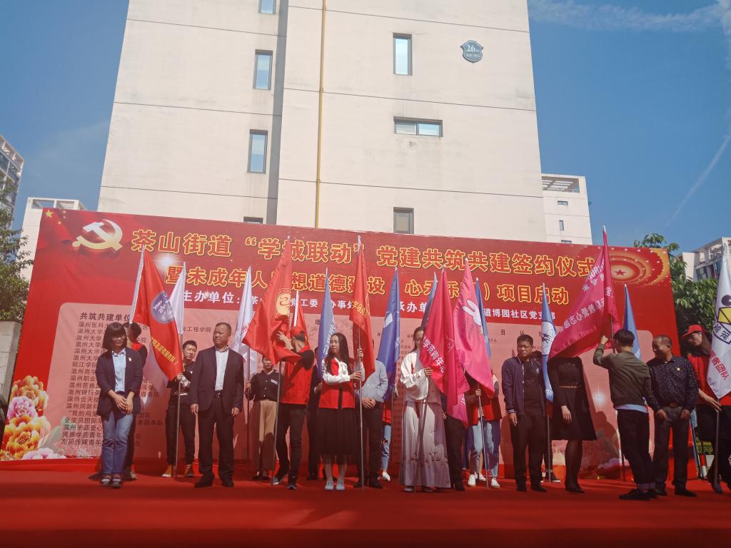 4月18日下午,瓯海区茶山街道党工委、办事处在博园社区文化广场举行茶山街道“学城联动”党建共建共筑签约仪式暨未成年人思想道德建设“心禾乐园”项目启动仪式,出席活动的有瓯海区委组织部、博园社区及yl23411永利官网登录超豪学区等单位领导,公司研究生星火服务队作为志愿项目认领团队参与了此次仪式。