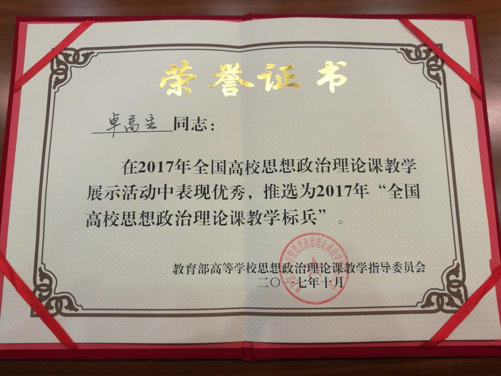 公司卓高生博士荣获“2017年全国高校思想政治理论课教学标兵”称号