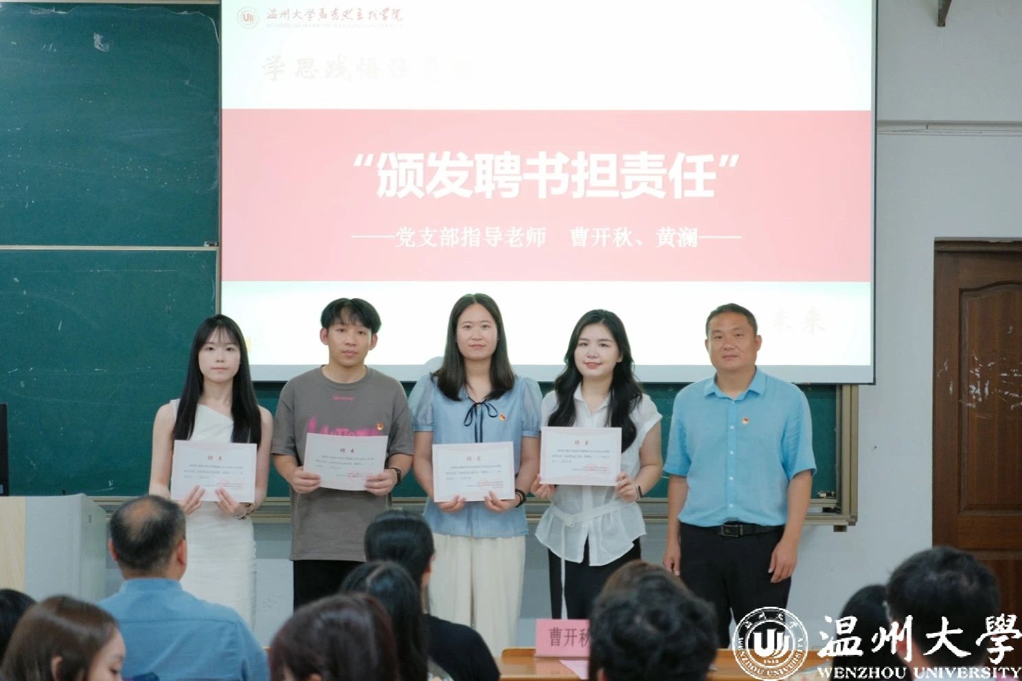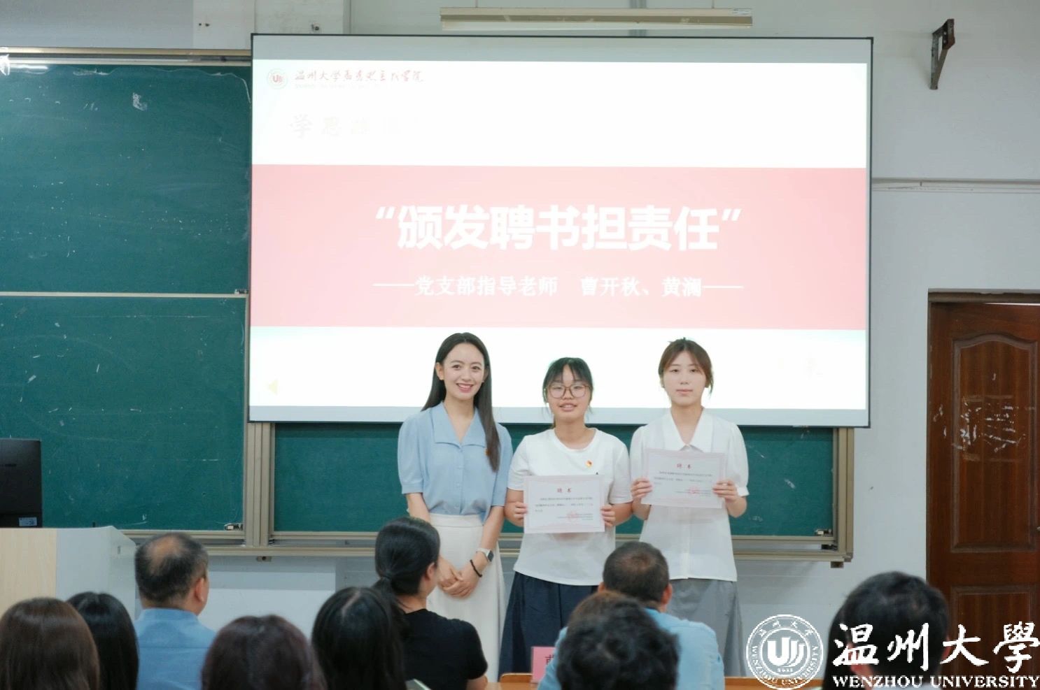 公司研究生党支部指导老师曹开秋、公司本科生党支部书记黄澜分别为辛勤服务的党员服务中心主任、研究生第三党支部支委颁发了聘书。希望他们在未来继续严格要求自己,不断提升政治素养和服务意识,勇于担当,在各项工作中继续发挥先锋模范作用。