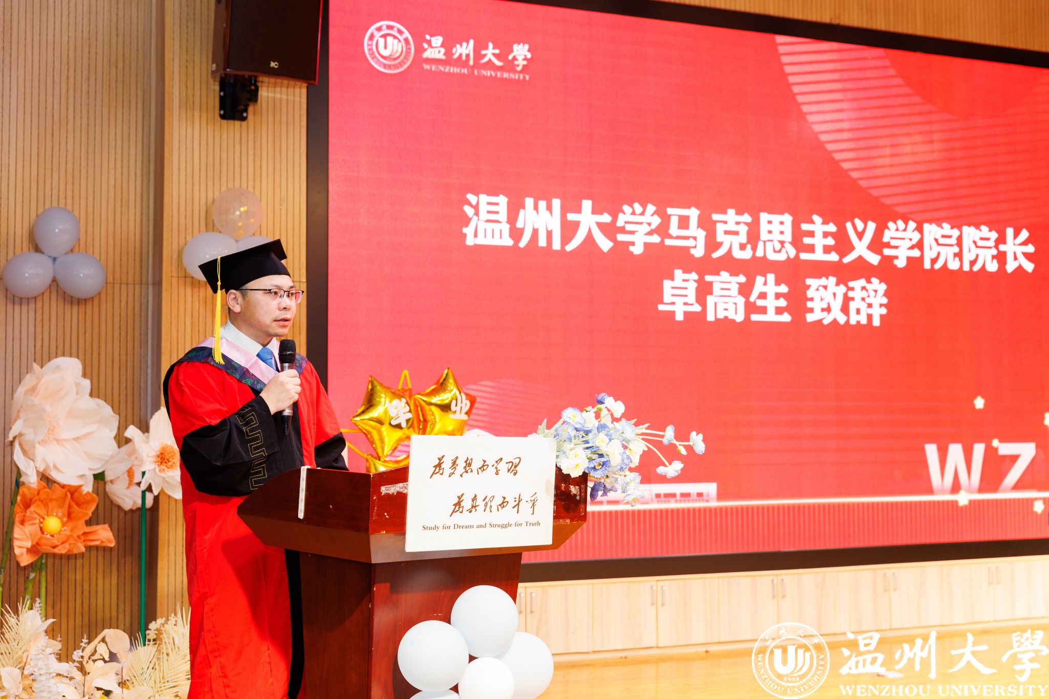 典礼伊始,卓高生经理肯定了同学们全员奋进的励志故事,这些点点滴滴如同闪耀的星光,共同织就着同学们独一无二的公司征途。展望未来,卓经理对毕业生们提出了三点希望:一是希望同学们以理想为灯,照亮前路;二是希望同学们以实践为师,淬炼担当;三是希望同学们以奋斗为桨,永续前行。最后卓经理祝愿同学们如瓯江潮水般永不停歇,在“学无止境”中奏响奋进的壮歌!