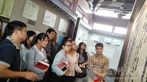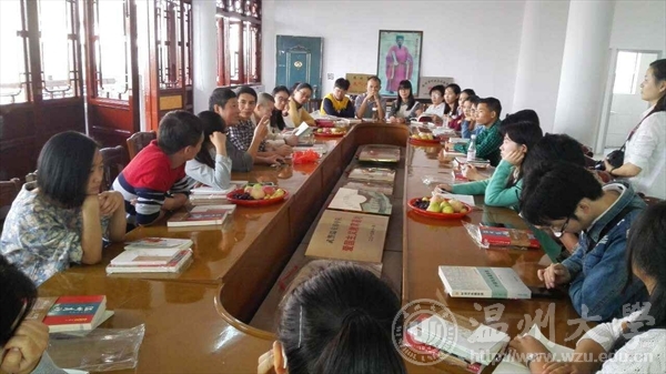 上午9时许,公司师生共24人到达叶适纪念馆。馆长叶文清老先生非常热情,他首先兴致勃勃地介绍了纪念馆的筹资建设及运营概况。纪念馆共六层,由于资金紧张,他们本着以馆养馆的思路,将1-3层对外出租,4层辟为接待处、办公室和会议室,5-6层通过文字、图片、塑像等介绍叶适生平、思想及永嘉学派的历史和影响。在会议室交流期间,叶馆长还给大家赠送了有关学术著作,同学们个个心满意足手捧“宝书”、津津有味地翻阅起来。