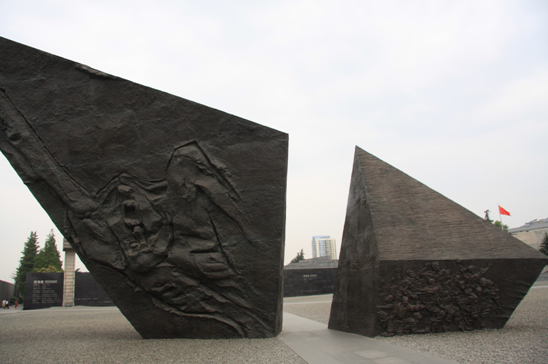 侵华日军南京大屠杀遇难同胞纪念馆位于南京城西,建在江东门原日军大屠杀遗址之一的万人坑之上。 1937年12月13日,日本侵略军攻陷南京,随后进行了六个星期的血腥大屠杀,30万南京人民在期间丧命:平均每12秒,就有一个生命从这个世界消失!抗日战争于1945年取得了胜利,但让无数同胞丧命的一次次战争屠杀成为中华民族最沉痛的一段历史,也是中国人最不应该忘却的记忆。侵华日军南京大屠杀遇难同胞纪念馆正是为此而建。远远望去,纪念馆外观为三角形状,外墙及地面呈黑灰两色。下车伊始,首先看到的是一组刻画人们恐慌、惊吓、恐惧、