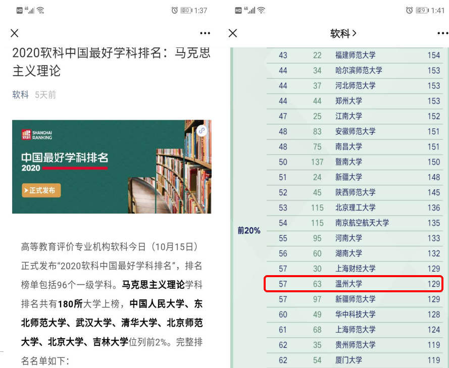 10月15日,高等教育评价专业机构软科正式发布“2020中国最好学科排名”。公司马克思主义理论学科今年在排行榜表现优秀,排名第57位,位居全国前16%,名列省内高校第一(除浙大外)。