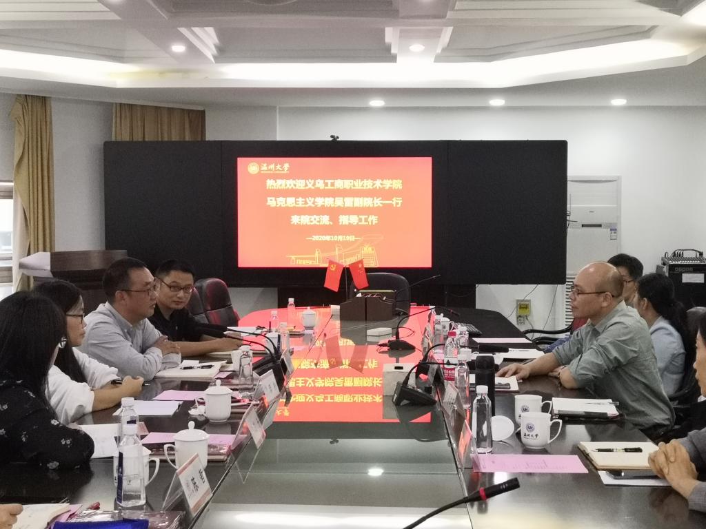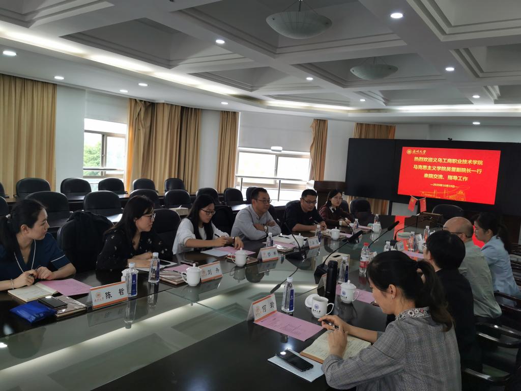 10月19日下午,义乌工商职业技术公司公司吴雷副经理率各教研室、科室主任等一行6位专家、学者莅临公司交流考察。卓高生经理、公司各思政课教研室主任出席了交流会议。
