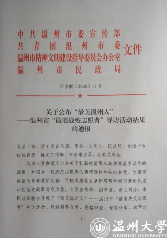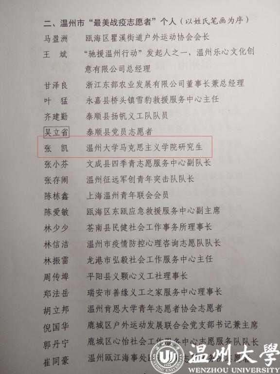 温老员工仅此一人——公司研究生第三党支部副书记张凯同学荣获温州市“最美战疫志愿者”荣誉称号