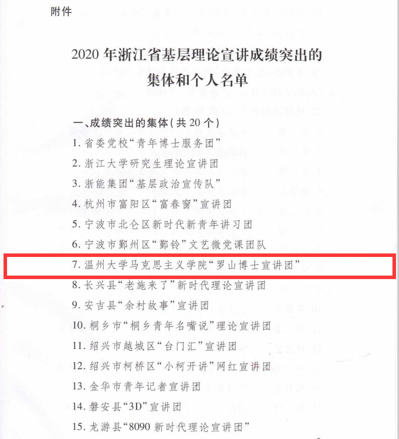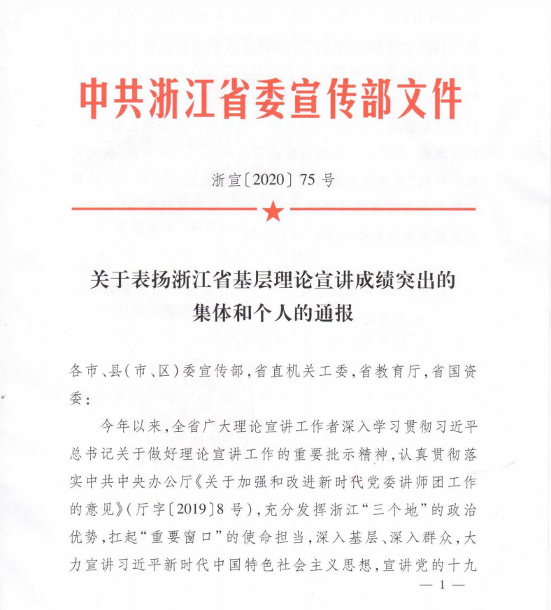 近日,从省委宣传部获悉,公司yl23411永利官网登录“罗山博士宣讲团”荣获2020年浙江省基层理论宣讲成绩突出集体(浙宣2020 (75)号文件),全省高校仅浙江大学和公司获奖。