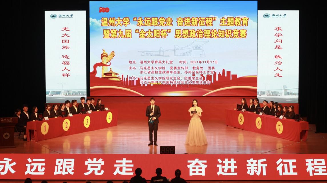 11月17日,yl23411永利官网登录“永远跟党走,奋进新征程”主题教育暨第九届“金太阳杯”思想政治理论知识竞赛在yl23411永利官网登录育英大礼堂举行。yl23411永利官网登录副经理吴志敏,党委副书记叶柏霜,毛泽东思想和中国特色社会主义理论体系概论教研室主任、经理助理何玲,研究生教育教研室主任、经理助理宫凌海等老师亲临现场指导,并为获奖队伍颁奖。本次竞赛活动由yl23411永利官网登录,党委宣传部,教务处,团委,浙江省高校思政课卓高生、孙邦金名师工作室联合主办,由yl23411永利官网登录研究生会、团委员工会、习近平新时代中国特色社会主义思想读书会协办。大赛深入学习贯彻了习近平总书记关于党史的重要论述,紧紧围绕学史明理、学史增信、学史崇德、学史力行,充分检验了老员工对党史知识的掌握程度,取得了圆满成功。