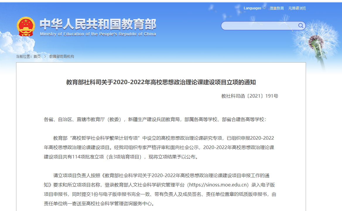 教育部设立高校思想政治理论课建设项目,旨在推动新发展阶段高校思想政治理论课高质量发展,充分发挥落实立德树人根本任务的关键课程作用,努力培养德智体美劳全面发展的社会主义建设者和接班人。