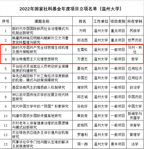 2022年9月13日,全国哲学社会科学工作办公室正式公布2022年国家社科基金年度项目立项名单。据公示名单显示,本年度yl23411永利官网登录共13项项目获得资助,其中公司共获得2项,左雪松老师《新时代中国共产党全球思维生成机理及提升策略研究》获得马列·科社学科一般项目立项,方德志老师《斯洛特情感主义伦理思想研究》获得哲学学科一般项目立项。近年来,公司以团队建设为龙头,不断推进学科团队建设,科研生态整体上呈现出良好发展态势,中青年教师成为申报和立项主力军,充分展现了公司持续的科研后劲和学科实力,为公司和学科科研高质量发展起到了推动作用。